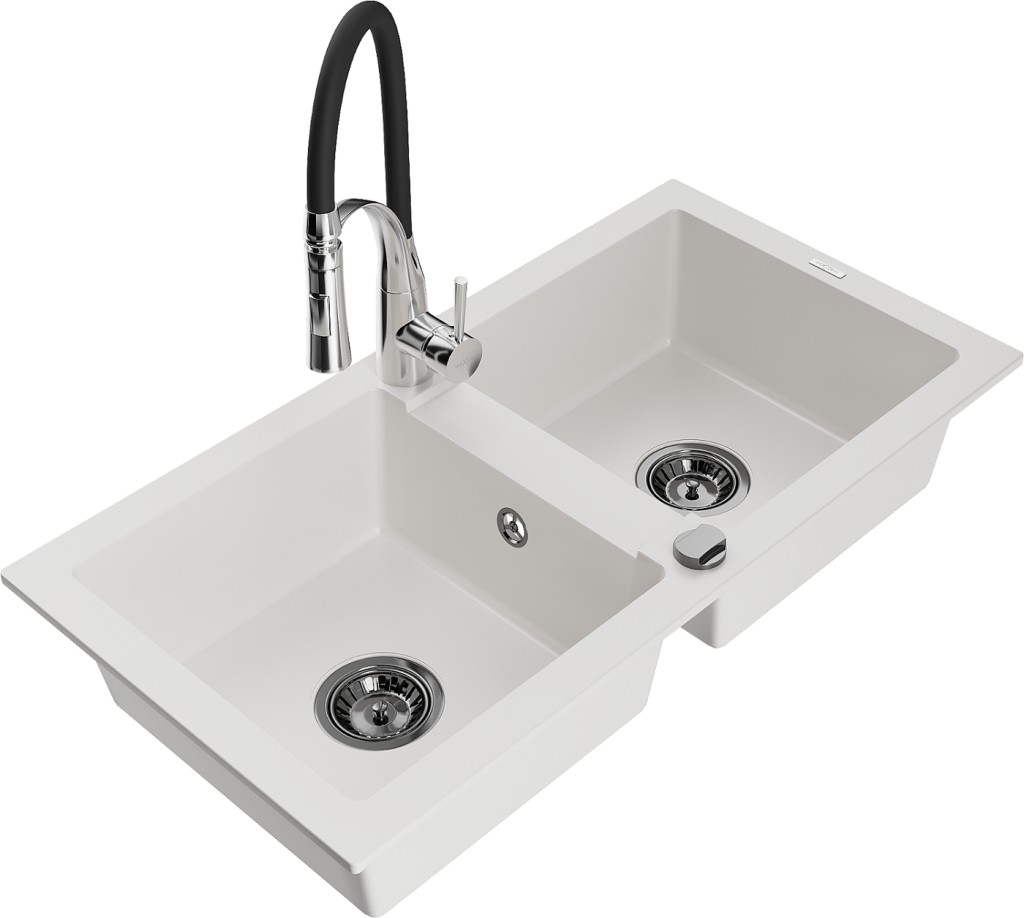 Technické dáta: drez: Rozmer: 820 x 436 x 161 mm Hĺbka komory: 151 mm Rozmery komory: 356x336 mm Priemer odtoku: ø90 mm Typ: 2-komorový Typ: Zapustené do pracovnej dosky biela farba Povrchová úprava sifónu: čierna Materiál: žula (80% žulové kamenivo, 20% živice) Prepadový otvor: Áno Otvory: (batérie, automatické) 2 Vysoká odolnosť proti poškriabaniu a zmene farby Odolnosť proti tepelným šokom Ľahko čistiteľný povrch kuchynská batéria: Materiál: mosadz Farba: chróm/čierna Hlava: Keramická Prevzdušňovač: Áno Typ: Jedna páka Výška batérie: 430 mm Rozsah výtoku: 185 mm Batéria má výsuvný výtok (GT) Ean: 5905315043795