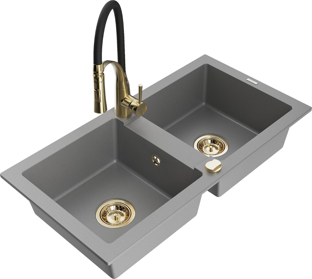 Technické dáta: drez: Rozmer: 820 x 436 x 161 mm Hĺbka komory: 151 mm Rozmery komory: 356x336 mm Priemer odtoku: ø90 mm Typ: 2-komorový Typ: Zapustené do pracovnej dosky Šedá farba Povrchová úprava sifónu: zlatá Materiál: žula (80% žulové kamenivo, 20% živice) Prepadový otvor: Áno Otvory: (batérie, automatické) 2 Vysoká odolnosť proti poškriabaniu a zmene farby Odolnosť proti tepelným šokom Ľahko čistiteľný povrch kuchynská batéria: Materiál: mosadz Farba: Zlatá/Čierna Hlava: Keramická Prevzdušňovač: Áno Typ: Jedna páka Výška batérie: 430 mm Rozsah výtoku: 185 mm Batéria má výsuvný výtok(GT) Ean: 5905315043924