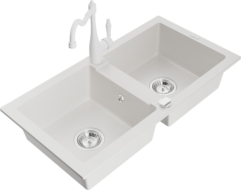 Technické dáta: drez: Rozmer: 820 x 436 x 161 mm Hĺbka komory: 151 mm Rozmery komory: 356x336 mm Priemer odtoku: ø90 mm Typ: 2-komorový Typ: Zapustené do pracovnej dosky biela farba Povrchová úprava sifónu: Chrome Materiál: žula (80% žulové kamenivo, 20% živice) Prepadový otvor: Áno Otvory: (batérie, automatické) 2 Vysoká odolnosť proti poškriabaniu a zmene farby Odolnosť proti tepelným šokom Ľahko čistiteľný povrch kuchynská batéria: Materiál: mosadz biela farba Hlava: Keramická Prevzdušňovač: Áno Typ: Jedna páka Výška batérie: 290 mm Rozsah výtoku: 260 mm(GT) Ean: 5905315038357
