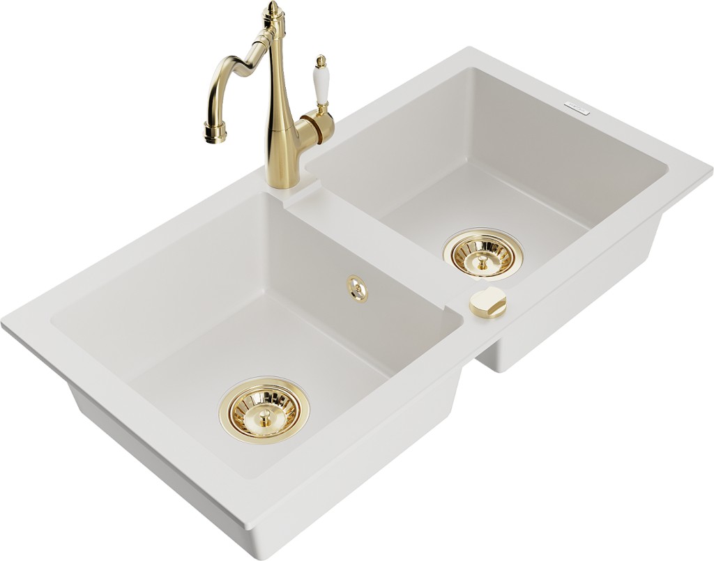 Technické dáta: drez: Rozmer: 820 x 436 x 161 mm Hĺbka komory: 151 mm Rozmery komory: 356x336 mm Priemer odtoku: ø90 mm Typ: 2-komorový Typ: Zapustené do pracovnej dosky biela farba Povrchová úprava sifónu: zlatá Materiál: žula (80% žulové kamenivo, 20% živice) Prepadový otvor: Áno Otvory: (batérie, automatické) 2 Vysoká odolnosť proti poškriabaniu a zmene farby Odolnosť proti tepelným šokom Ľahko čistiteľný povrch kuchynská batéria: Materiál: mosadz Farba: Zlatá Hlava: Keramická Prevzdušňovač: Áno Typ: Jedna páka Výška batérie: 290 mm Rozsah výtoku: 260 mm(GT) Ean: 5905315038364
