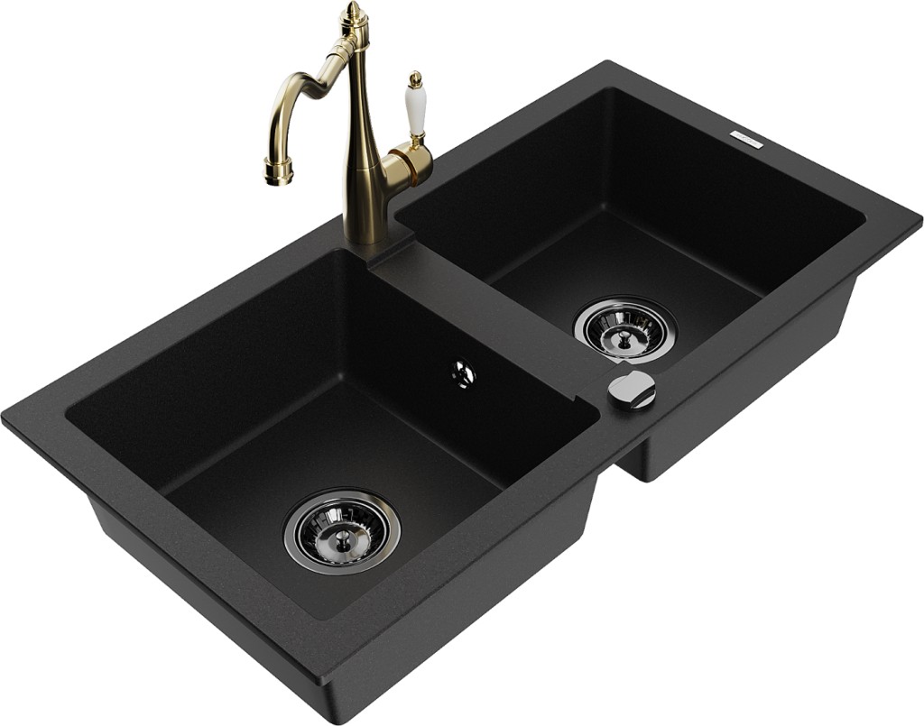 Technické dáta: drez: Rozmer: 820 x 436 x 161 mm Hĺbka komory: 151 mm Rozmery komory: 356x336 mm Priemer odtoku: ø90 mm Typ: 2-komorový Typ: Zapustené do pracovnej dosky Čierna farba Povrchová úprava sifónu: čierna Materiál: žula (80% žulové kamenivo, 20% živice) Prepadový otvor: Áno Otvory: (batérie, automatické) 2 Vysoká odolnosť proti poškriabaniu a zmene farby Odolnosť proti tepelným šokom Ľahko čistiteľný povrch kuchynská batéria: Materiál: mosadz Farba: Zlatá Hlava: Keramická Prevzdušňovač: Áno Typ: Jedna páka Výška batérie: 290 mm Rozsah výtoku: 260 mm(GT) Ean: 5905315038630