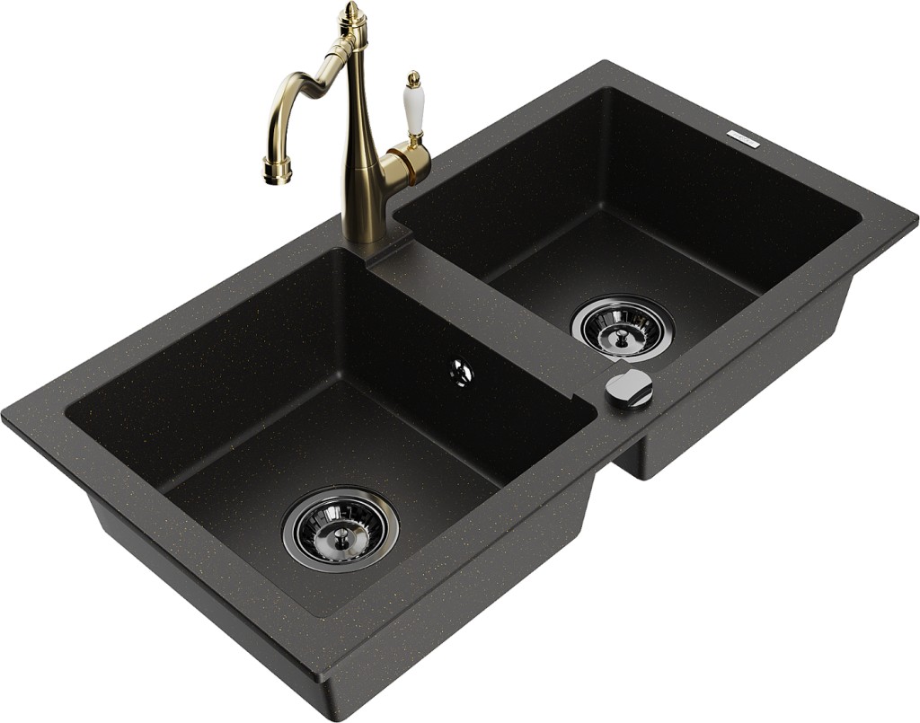 Technické dáta: drez: Rozmer: 820 x 436 x 161 mm Hĺbka komory: 151 mm Rozmery komory: 356x336 mm Priemer odtoku: ø90 mm Typ: 2-komorový Typ: Zapustené do pracovnej dosky Farba: čierna / zlatá metalíza Povrchová úprava sifónu: čierna Materiál: žula (80% žulové kamenivo, 20% živice) Prepadový otvor: Áno Otvory: (batérie, automatické) 2 Vysoká odolnosť proti poškriabaniu a zmene farby Odolnosť proti tepelným šokom Ľahko čistiteľný povrch kuchynská batéria: Materiál: mosadz Farba: Zlatá Hlava: Keramická Prevzdušňovač: Áno Typ: Jedna páka Výška batérie: 290 mm Rozsah výtoku: 260 mm(GT) Ean: 5905315038531