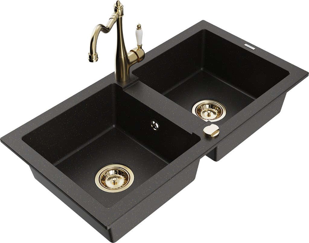 Technické dáta: drez: Rozmer: 820 x 436 x 161 mm Hĺbka komory: 151 mm Rozmery komory: 356x336 mm Priemer odtoku: ø90 mm Typ: 2-komorový Typ: Zapustené do pracovnej dosky Farba: čierna / zlatá metalíza Povrchová úprava sifónu: zlatá Materiál: žula (80% žulové kamenivo, 20% živice) Prepadový otvor: Áno Otvory: (batérie, automatické) 2 Vysoká odolnosť proti poškriabaniu a zmene farby Odolnosť proti tepelným šokom Ľahko čistiteľný povrch kuchynská batéria: Materiál: mosadz Farba: Zlatá Hlava: Keramická Prevzdušňovač: Áno Typ: Jedna páka Výška batérie: 290 mm Rozsah výtoku: 260 mm(GT) Ean: 5905315038524
