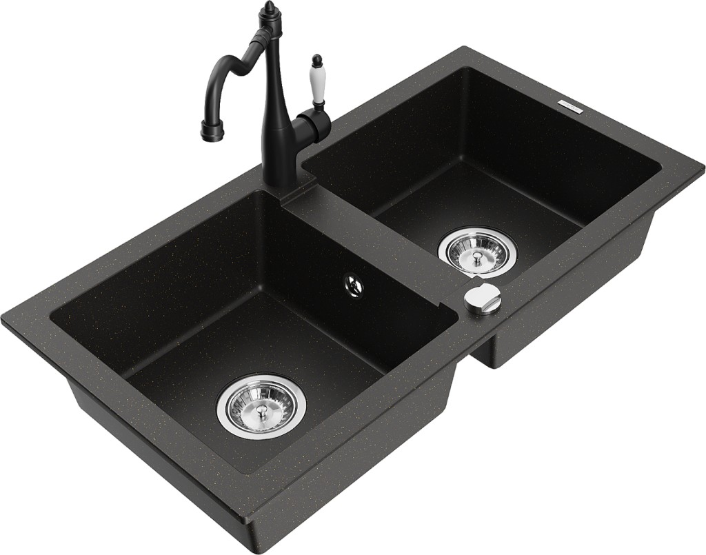 Technické dáta: drez: Rozmer: 820 x 436 x 161 mm Hĺbka komory: 151 mm Rozmery komory: 356x336 mm Priemer odtoku: ø90 mm Typ: 2-komorový Typ: Zapustené do pracovnej dosky Farba: čierna / zlatá metalíza Povrchová úprava sifónu: Chrome Materiál: žula (80% žulové kamenivo, 20% živice) Prepadový otvor: Áno Otvory: (batérie, automatické) 2 Vysoká odolnosť proti poškriabaniu a zmene farby Odolnosť proti tepelným šokom Ľahko čistiteľný povrch kuchynská batéria: Materiál: mosadz Čierna farba Hlava: Keramická Prevzdušňovač: Áno Typ: Jedna páka Výška batérie: 290 mm Rozsah výtoku: 260 mm(GT) Ean: 5905315038548