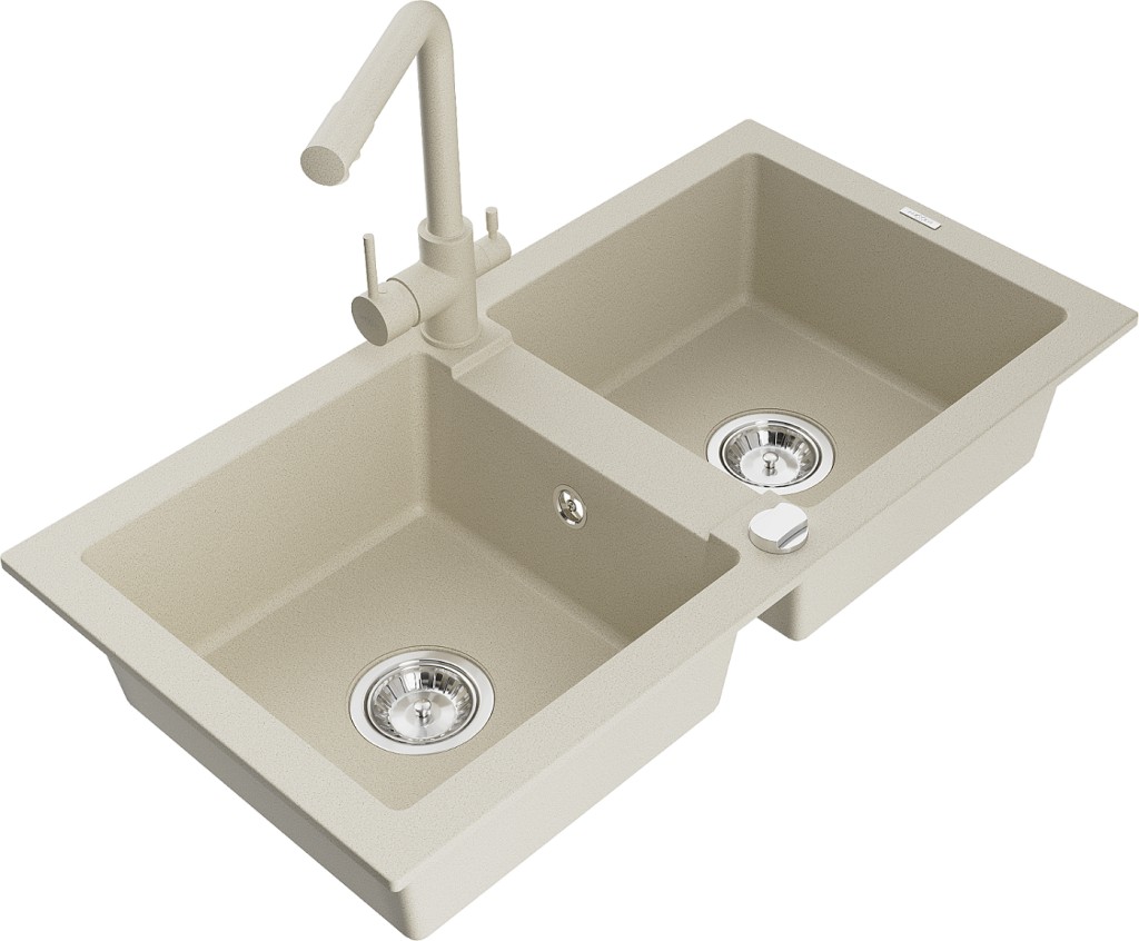 Technické dáta: drez: Rozmer: 820 x 436 x 161 mm Hĺbka komory: 151 mm Rozmery komory: 356x336 mm Priemer odtoku: ø90 mm Typ: 2-komorový Typ: Zapustené do pracovnej dosky Farba béžová Povrchová úprava sifónu: Chrome Materiál: žula (80% žulové kamenivo, 20% živice) Prepadový otvor: Áno Otvory: (batérie, automatické) 2 Vysoká odolnosť proti poškriabaniu a zmene farby Odolnosť proti tepelným šokom Ľahko čistiteľný povrch kuchynská batéria: Materiál: mosadz Farba béžová Hlava: Keramická Prevzdušňovač: Áno Typ: Dve rukoväte Rozsah výtoku: 235 mm Výška batérie: 315 mm Dvojhlavá batéria s prídavným kanálom pre filtrovanú pitnú vodu(GT) Ean: 5905315023025