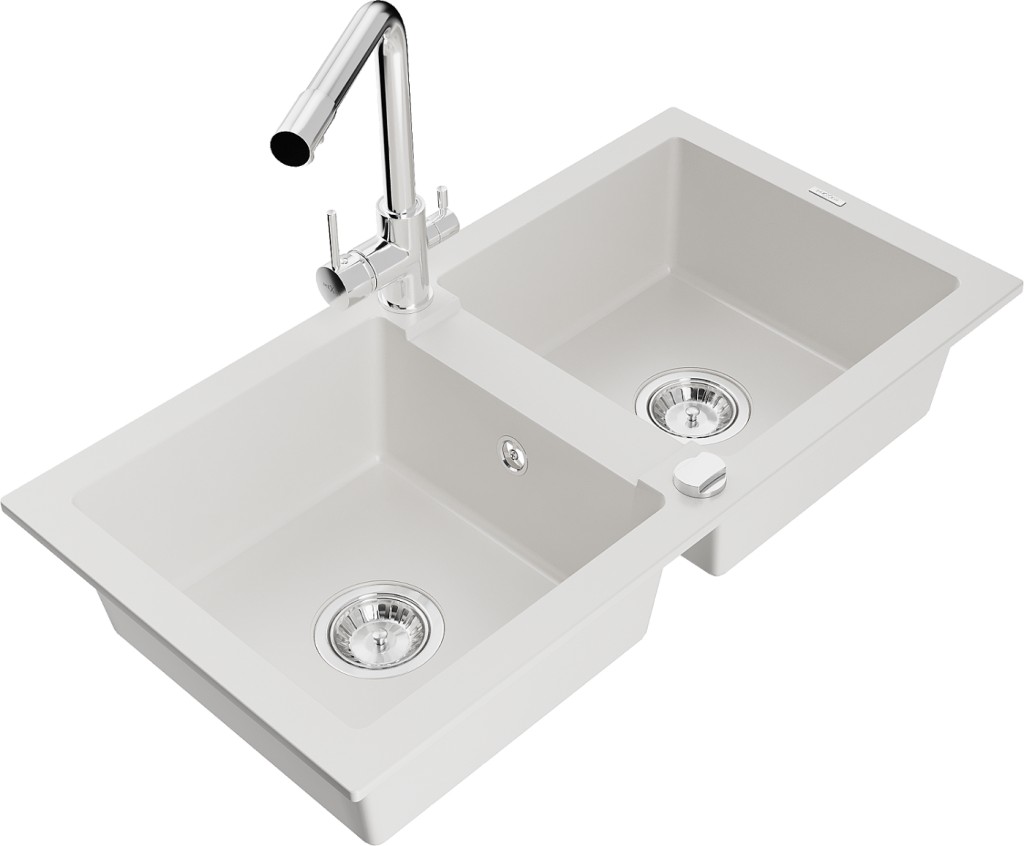 Technické dáta: drez: Rozmer: 820 x 436 x 161 mm Hĺbka komory: 151 mm Rozmery komory: 356x336 mm Priemer odtoku: ø90 mm Typ: 2-komorový Typ: Zapustené do pracovnej dosky biela farba Povrchová úprava sifónu: Chrome Materiál: žula (80% žulové kamenivo, 20% živice) Prepadový otvor: Áno Otvory: (batérie, automatické) 2 Vysoká odolnosť proti poškriabaniu a zmene farby Odolnosť proti tepelným šokom Ľahko čistiteľný povrch kuchynská batéria: Materiál: mosadz Farba: Chrome Hlava: Keramická Prevzdušňovač: Áno Typ: Dve rukoväte Rozsah výtoku: 235 mm Výška batérie: 315 mm Dvojhlavá batéria s prídavným kanálom pre filtrovanú pitnú vodu (GT) Ean: 5905315022974
