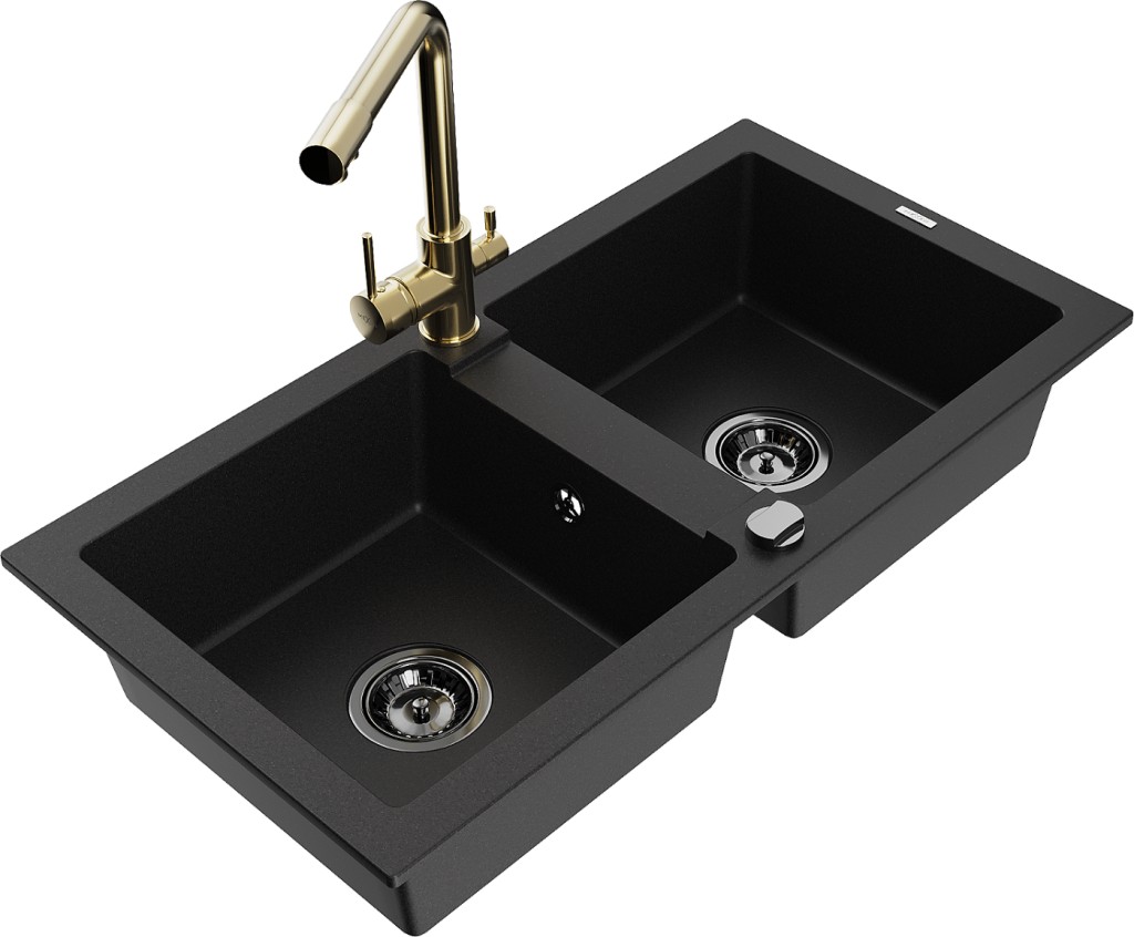 Technické dáta: drez: Rozmer: 820 x 436 x 161 mm Hĺbka komory: 151 mm Rozmery komory: 356x336 mm Priemer odtoku: ø90 mm Typ: 2-komorový Typ: Zapustené do pracovnej dosky Čierna farba Povrchová úprava sifónu: čierna Materiál: žula (80% žulové kamenivo, 20% živice) Prepadový otvor: Áno Otvory: (batérie, automatické) 2 Vysoká odolnosť proti poškriabaniu a zmene farby Odolnosť proti tepelným šokom Ľahko čistiteľný povrch kuchynská batéria: Materiál: mosadz Farba: Zlatá Hlava: Keramická Prevzdušňovač: Áno Typ: Dve rukoväte Rozsah výtoku: 235 mm Výška batérie: 315 mm Dvojhlavá batéria s prídavným kanálom pre filtrovanú pitnú vodu(GT) Ean: 5905315023261