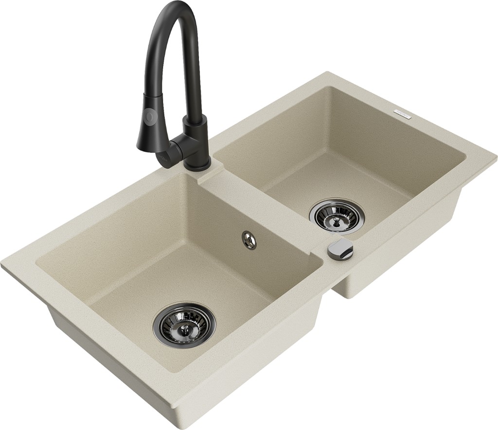 Technické dáta: drez: Rozmer: 820 x 436 x 161 mm Hĺbka komory: 151 mm Rozmery komory: 356x336 mm Priemer odtoku: ø90 mm Typ: 2-komorový Typ: Zapustené do pracovnej dosky Farba béžová Povrchová úprava sifónu: čierna Materiál: žula (80% žulové kamenivo, 20% živice) Prepadový otvor: Áno Otvory: (batérie, automatické) 2 Vysoká odolnosť proti poškriabaniu a zmene farby Odolnosť proti tepelným šokom Ľahko čistiteľný povrch kuchynská batéria: Materiál: mosadz Čierna farba Hlava: Keramická Prevzdušňovač: Áno Typ: Jedna páka Výška batérie: 380 mm Rozsah výtoku: 252 mm Typ výtoku: Výsuvný(GT) Ean: 5905315028150