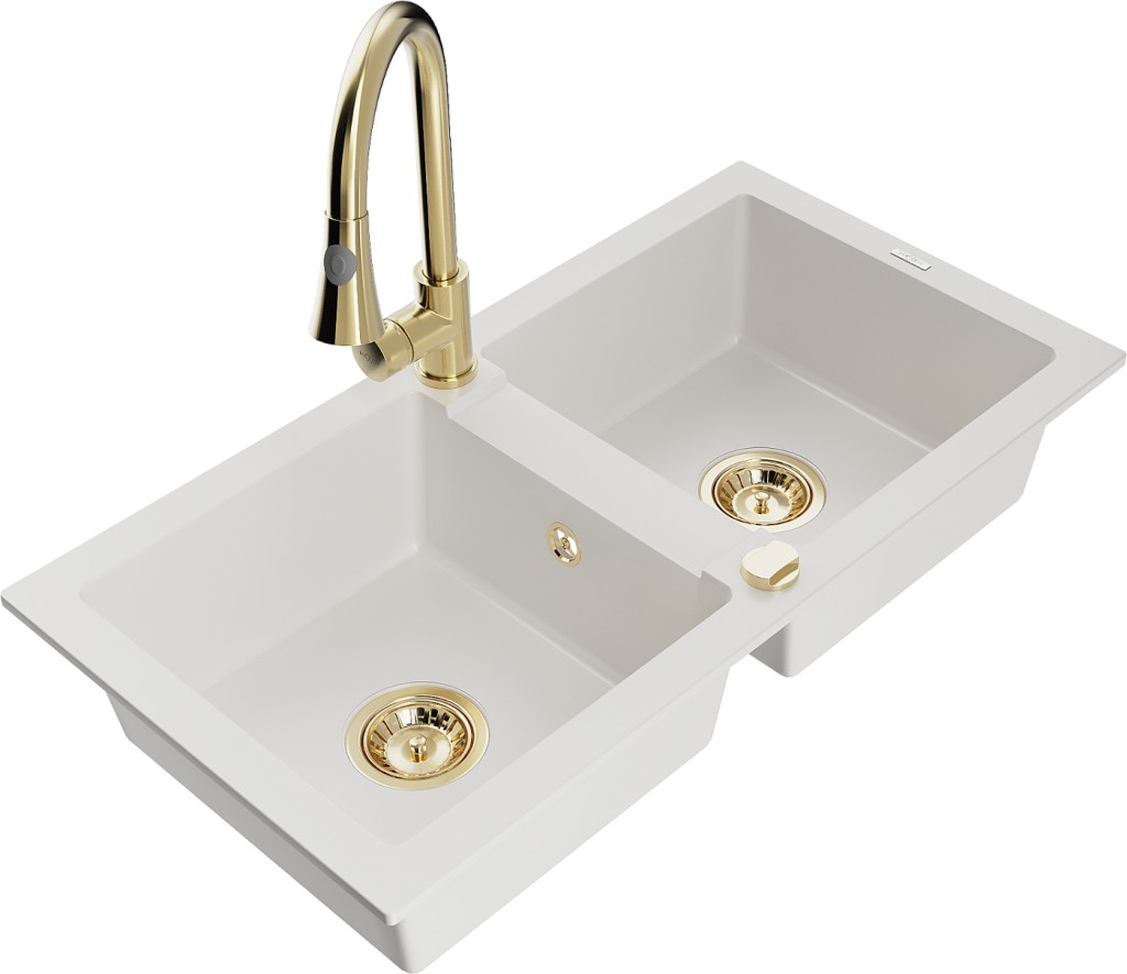 Technické dáta: drez: Rozmer: 820 x 436 x 161 mm Hĺbka komory: 151 mm Rozmery komory: 356x336 mm Priemer odtoku: ø90 mm Typ: 2-komorový Typ: Zapustené do pracovnej dosky biela farba Povrchová úprava sifónu: zlatá Materiál: žula (80% žulové kamenivo, 20% živice) Prepadový otvor: Áno Otvory: (batérie, automatické) 2 Vysoká odolnosť proti poškriabaniu a zmene farby Odolnosť proti tepelným šokom Ľahko čistiteľný povrch kuchynská batéria: Materiál: mosadz Farba: Zlatá Hlava: Keramická Prevzdušňovač: Áno Typ: Jedna páka Výška batérie: 380 mm Rozsah výtoku: 252 mm Typ výtoku: Výsuvný(GT) Ean: 5905315028105