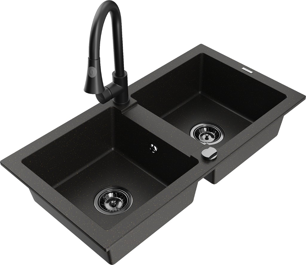 Technické dáta: drez: Rozmer: 820 x 436 x 161 mm Hĺbka komory: 151 mm Rozmery komory: 356x336 mm Priemer odtoku: ø90 mm Typ: 2-komorový Typ: Zapustené do pracovnej dosky Farba: čierna / zlatá metalíza Povrchová úprava sifónu: čierna Materiál: žula (80% žulové kamenivo, 20% živice) Prepadový otvor: Áno Otvory: (batérie, automatické) 2 Vysoká odolnosť proti poškriabaniu a zmene farby Odolnosť proti tepelným šokom Ľahko čistiteľný povrch kuchynská batéria: Materiál: mosadz Čierna farba Hlava: Keramická Prevzdušňovač: Áno Typ: Jedna páka Výška batérie: 380 mm Rozsah výtoku: 252 mm Typ výtoku: Výsuvný(GT) Ean: 5905315028297