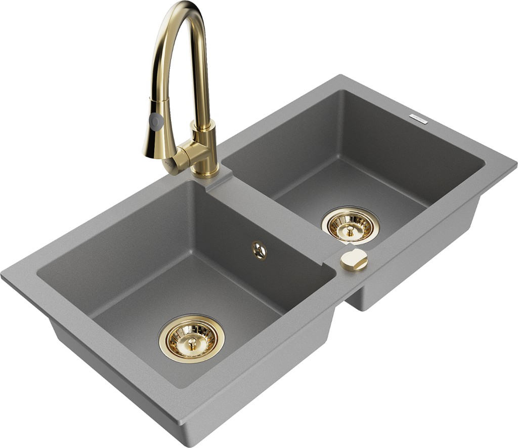 Technické dáta: drez: Rozmer: 820 x 436 x 161 mm Hĺbka komory: 151 mm Rozmery komory: 356x336 mm Priemer odtoku: ø90 mm Typ: 2-komorový Typ: Zapustené do pracovnej dosky Šedá farba Povrchová úprava sifónu: zlatá Materiál: žula (80% žulové kamenivo, 20% živice) Prepadový otvor: Áno Otvory: (batérie, automatické) 2 Vysoká odolnosť proti poškriabaniu a zmene farby Odolnosť proti tepelným šokom Ľahko čistiteľný povrch kuchynská batéria: Materiál: mosadz Farba: Zlatá Hlava: Keramická Prevzdušňovač: Áno Typ: Jedna páka Výška batérie: 380 mm Rozsah výtoku: 252 mm Typ výtoku: Výsuvný(GT) Ean: 5905315028174
