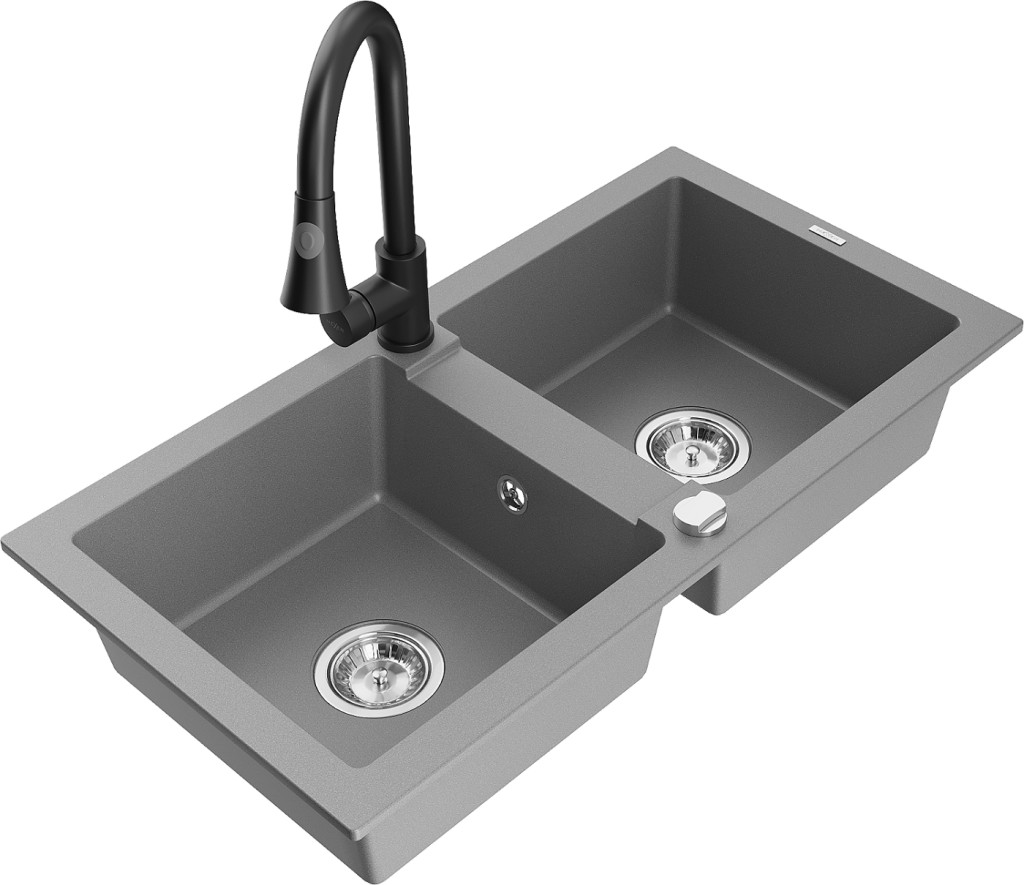 Technické dáta: drez: Rozmer: 820 x 436 x 161 mm Hĺbka komory: 151 mm Rozmery komory: 356x336 mm Priemer odtoku: ø90 mm Typ: 2-komorový Typ: Zapustené do pracovnej dosky Šedá farba Povrchová úprava sifónu: Chrome Materiál: žula (80% žulové kamenivo, 20% živice) Prepadový otvor: Áno Otvory: (batérie, automatické) 2 Vysoká odolnosť proti poškriabaniu a zmene farby Odolnosť proti tepelným šokom Ľahko čistiteľný povrch kuchynská batéria: Materiál: mosadz Čierna farba Hlava: Keramická Prevzdušňovač: Áno Typ: Jedna páka Výška batérie: 380 mm Rozsah výtoku: 252 mm Typ výtoku: Výsuvný(GT) Ean: 5905315028181