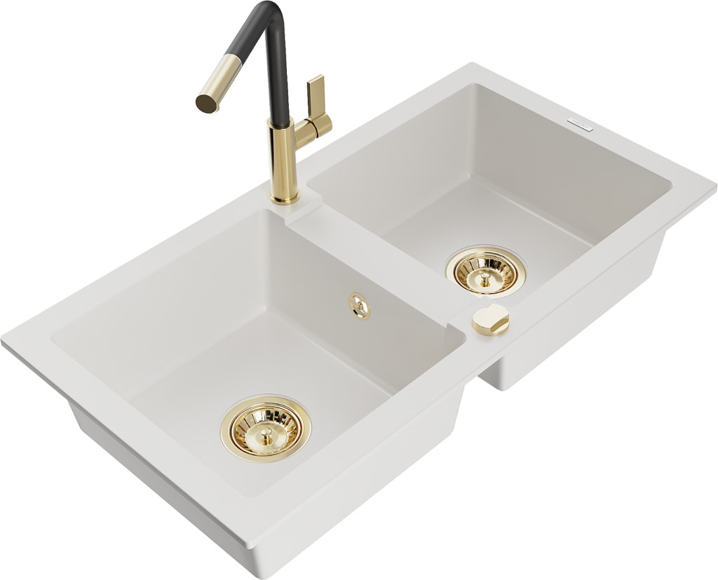 Technické dáta: drez: Rozmer: 820 x 436 x 161 mm Hĺbka komory: 151 mm Rozmery komory: 356x336 mm Priemer odtoku: ø90 mm Typ: 2-komorový Typ: Zapustené do pracovnej dosky biela farba Povrchová úprava sifónu: zlatá Materiál: žula (80% žulové kamenivo, 20% živice) Prepadový otvor: Áno Otvory: (batérie, automatické) 2 Vysoká odolnosť proti poškriabaniu a zmene farby Odolnosť proti tepelným šokom Ľahko čistiteľný povrch kuchynská batéria: Materiál: mosadz Farba: Zlatá/Čierna Hlava: Keramická Prevzdušňovač: Áno Typ: Jedna páka Rozsah výtoku: 245 mm Výška batérie: 307 mm(GT) Ean: 5905315057501