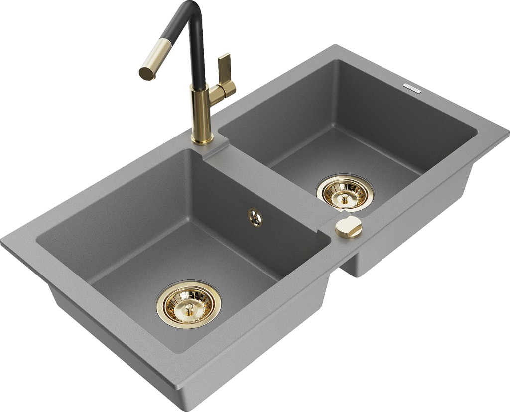 Technické dáta: drez: Rozmer: 820 x 436 x 161 mm Hĺbka komory: 151 mm Rozmery komory: 356x336 mm Priemer odtoku: ø90 mm Typ: 2-komorový Typ: Zapustené do pracovnej dosky Šedá farba Povrchová úprava sifónu: zlatá Materiál: žula (80% žulové kamenivo, 20% živice) Prepadový otvor: Áno Otvory: (batérie, automatické) 2 Vysoká odolnosť proti poškriabaniu a zmene farby Odolnosť proti tepelným šokom Ľahko čistiteľný povrch kuchynská batéria: Materiál: mosadz Farba: Zlatá/Čierna Hlava: Keramická Prevzdušňovač: Áno Typ: Jedna páka Rozsah výtoku: 245 mm Výška batérie: 307 mm(GT) Ean: 5905315057648