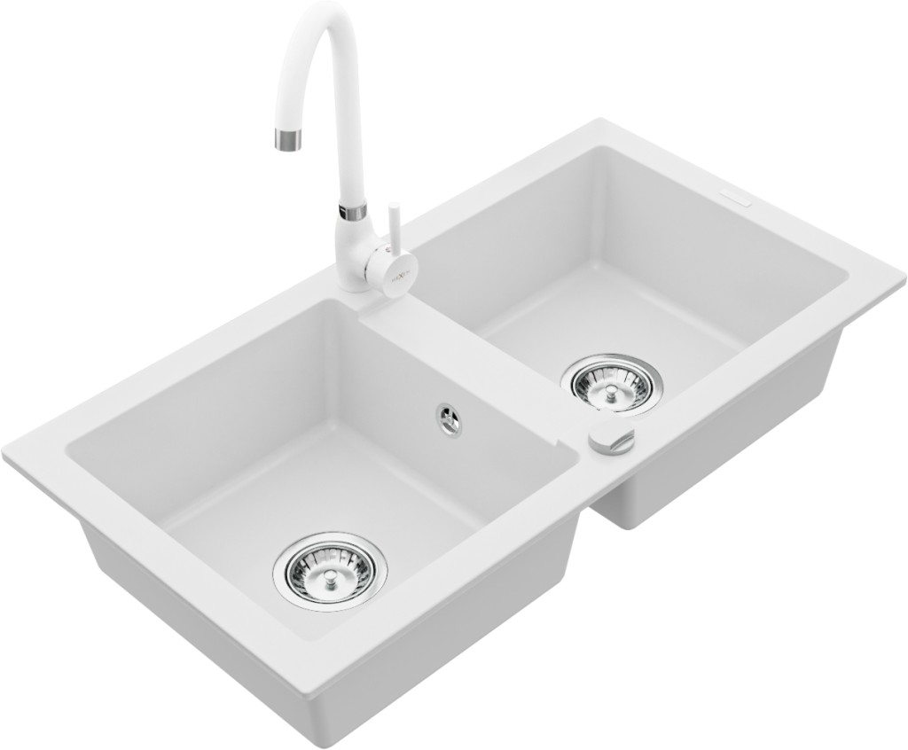Technické dáta: drez: Rozmer: 820 x 436 x 161 mm Hĺbka komory: 151 mm Rozmery komory: 356x336 mm Priemer odtoku: ø90 mm Typ: 2-komorový Typ: Zapustené do pracovnej dosky biela farba Povrchová úprava sifónu: Chrome Materiál: žula (80% žulové kamenivo, 20% živice) Prepadový otvor: Áno Otvory: (batérie, automatické) 2 Vysoká odolnosť proti poškriabaniu a zmene farby Odolnosť proti tepelným šokom Ľahko čistiteľný povrch kuchynská batéria: Materiál: mosadz biela farba Hlava: Keramická Prevzdušňovač: Áno Výška batérie: 335 mm Rozsah výtoku: 180 mm(GT) Ean: 5907709189416