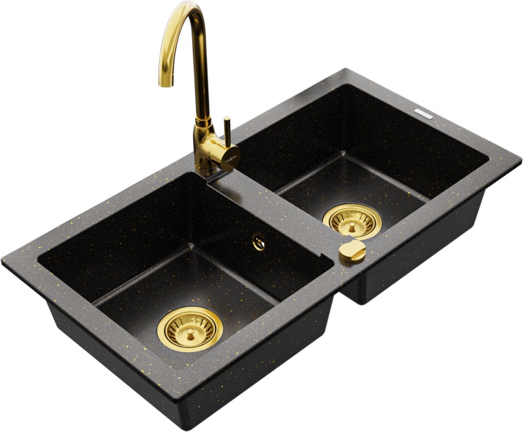 Technické dáta: drez: Rozmer: 820 x 436 x 161 mm Hĺbka komory: 151 mm Rozmery komory: 356x336 mm Priemer odtoku: ø90 mm Typ: 2-komorový Typ: Zapustené do pracovnej dosky Farba: čierna / zlatá metalíza Povrchová úprava sifónu: zlatá Materiál: žula (80% žulové kamenivo, 20% živice) Prepadový otvor: Áno Otvory: (batérie, automatické) 2 Vysoká odolnosť proti poškriabaniu a zmene farby Odolnosť proti tepelným šokom Ľahko čistiteľný povrch kuchynská batéria: Materiál: mosadz Farba: Zlatá Hlava: Keramická Prevzdušňovač: Áno Výška batérie: 335 mm Rozsah výtoku: 180 mm(GT) Ean: 5907709189485