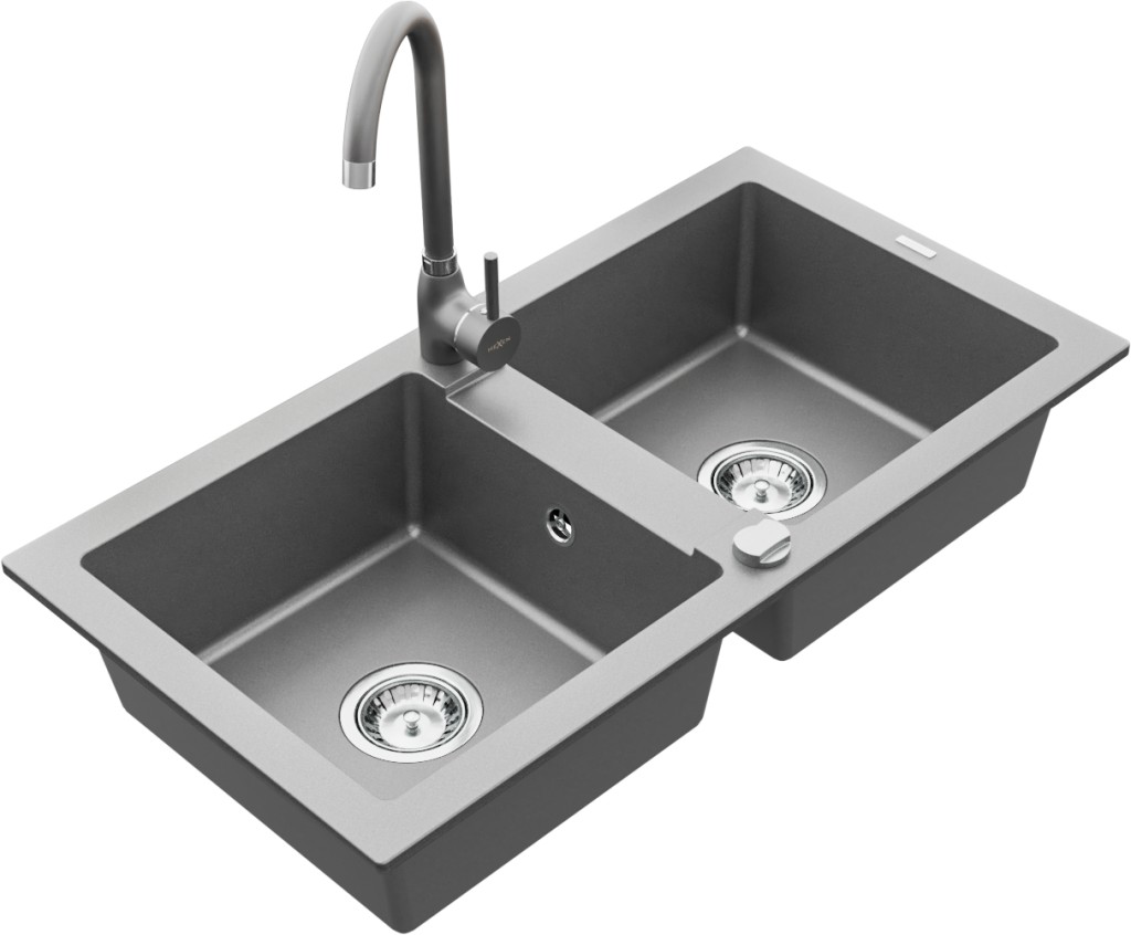 Technické dáta: drez: Rozmer: 820 x 436 x 161 mm Hĺbka komory: 151 mm Rozmery komory: 356x336 mm Priemer odtoku: ø90 mm Typ: 2-komorový Typ: Zapustené do pracovnej dosky Šedá farba Povrchová úprava sifónu: Chrome Materiál: žula (80% žulové kamenivo, 20% živice) Prepadový otvor: Áno Otvory: (batérie, automatické) 2 Vysoká odolnosť proti poškriabaniu a zmene farby Odolnosť proti tepelným šokom Ľahko čistiteľný povrch kuchynská batéria: Materiál: mosadz Šedá farba Hlava: Keramická Prevzdušňovač: Áno Výška batérie: 335 mm Rozsah výtoku: 180 mm(GT) Ean: 5907709189454