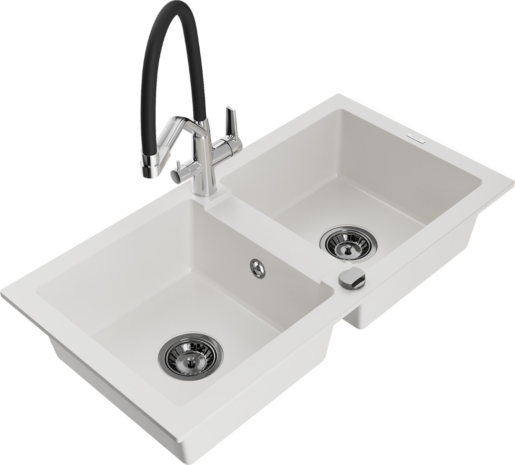 Technické dáta: drez: Rozmer: 820 x 436 x 161 mm Hĺbka komory: 151 mm Rozmery komory: 356x336 mm Priemer odtoku: ø90 mm Typ: 2-komorový Typ: Zapustené do pracovnej dosky biela farba Povrchová úprava sifónu: čierna Materiál: žula (80% žulové kamenivo, 20% živice) Prepadový otvor: Áno Otvory: (batérie, automatické) 2 Vysoká odolnosť proti poškriabaniu a zmene farby Odolnosť proti tepelným šokom Ľahko čistiteľný povrch kuchynská batéria: Materiál: mosadz Povrchová úprava: chróm / čierna Hlavy: Keramické Prevzdušňovač: Áno Typ hubica: Flexibilný s mosadzným držiakom Rozsah výtoku: 260 mm Výška: 405 mm Typ: Dve rukoväte Dvojhlavá batéria s prídavným filtrom na pitnú vodu(GT) Ean: 5905315045638