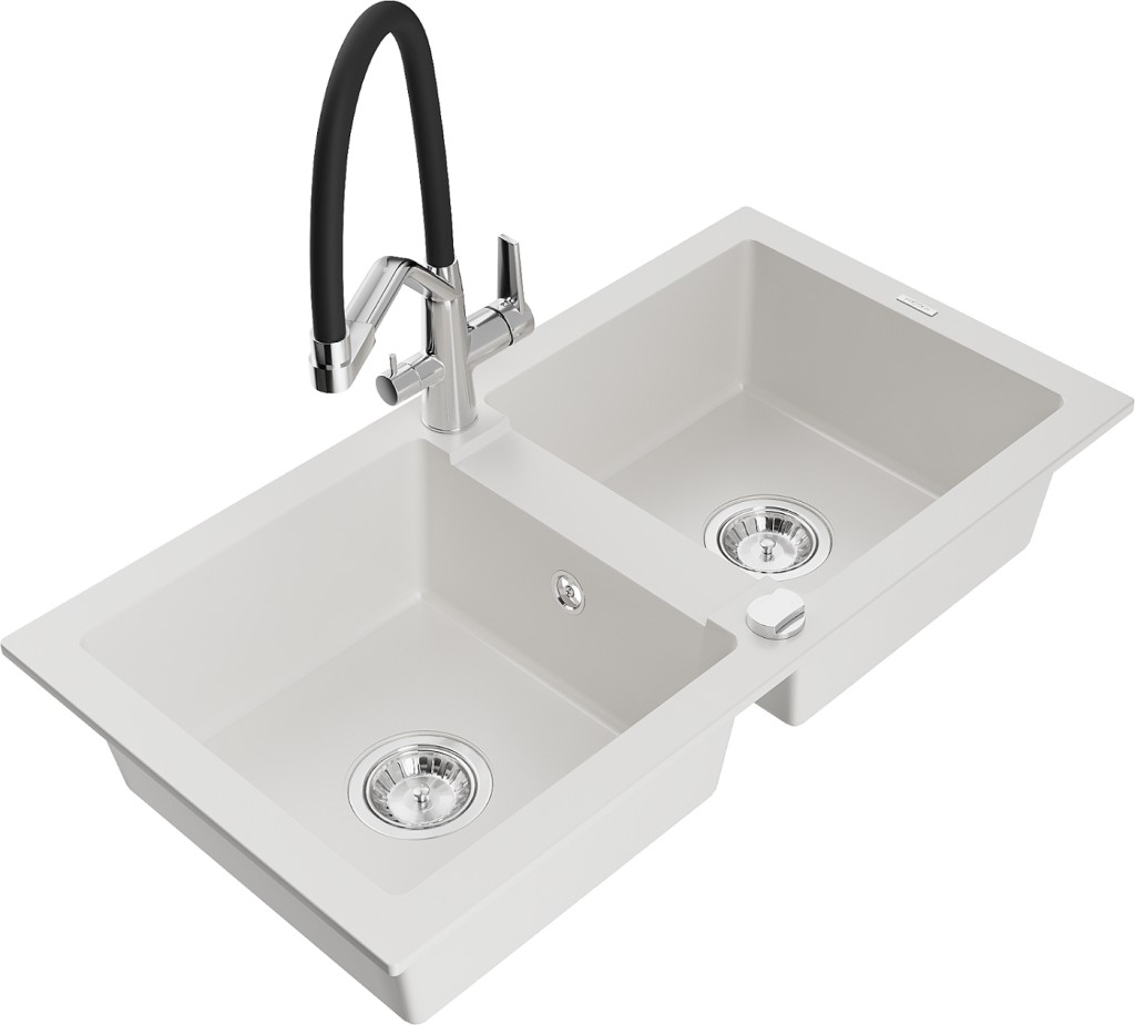 Technické dáta: drez: Rozmer: 820 x 436 x 161 mm Hĺbka komory: 151 mm Rozmery komory: 356x336 mm Priemer odtoku: ø90 mm Typ: 2-komorový Typ: Zapustené do pracovnej dosky biela farba Povrchová úprava sifónu: Chrome Materiál: žula (80% žulové kamenivo, 20% živice) Prepadový otvor: Áno Otvory: (batérie, automatické) 2 Vysoká odolnosť proti poškriabaniu a zmene farby Odolnosť proti tepelným šokom Ľahko čistiteľný povrch kuchynská batéria: Materiál: mosadz Povrchová úprava: chróm / čierna Hlavy: Keramické Prevzdušňovač: Áno Typ hubica: Flexibilný s mosadzným držiakom Rozsah výtoku: 260 mm Výška: 405 mm Typ: Dve rukoväte Dvojhlavá batéria s prídavným filtrom na pitnú vodu(GT) Ean: 5905315045577