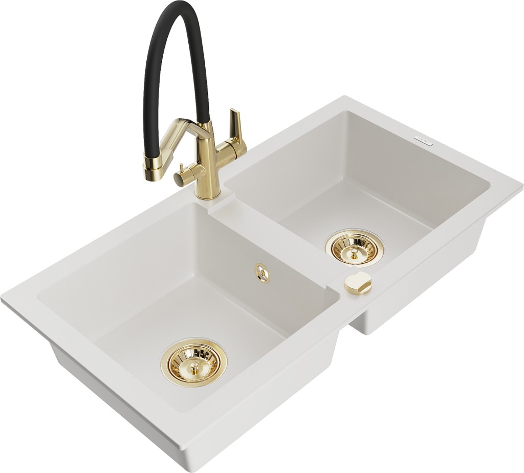 Technické dáta: drez: Rozmer: 820 x 436 x 161 mm Hĺbka komory: 151 mm Rozmery komory: 356x336 mm Priemer odtoku: ø90 mm Typ: 2-komorový Typ: Zapustené do pracovnej dosky biela farba Povrchová úprava sifónu: zlatá Materiál: žula (80% žulové kamenivo, 20% živice) Prepadový otvor: Áno Otvory: (batérie, automatické) 2 Vysoká odolnosť proti poškriabaniu a zmene farby Odolnosť proti tepelným šokom Ľahko čistiteľný povrch kuchynská batéria: Materiál: mosadz Povrchová úprava: zlatá/čierna Hlavy: Keramické Prevzdušňovač: Áno Typ hubica: Flexibilný s mosadzným držiakom Rozsah výtoku: 260 mm Výška: 405 mm Typ: Dve rukoväte Dvojhlavá batéria s prídavným filtrom na pitnú vodu(GT) Ean: 5905315045751