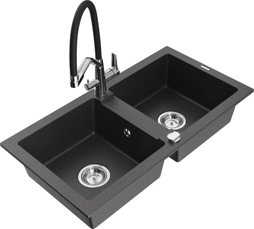 Technické dáta: drez: Rozmer: 820 x 436 x 161 mm Hĺbka komory: 151 mm Rozmery komory: 356x336 mm Priemer odtoku: ø90 mm Typ: 2-komorový Typ: Zapustené do pracovnej dosky Farba: Škvrnitá čierna Povrchová úprava sifónu: Chrome Materiál: žula (80% žulové kamenivo, 20% živice) Prepadový otvor: Áno Otvory: (batérie, automatické) 2 Vysoká odolnosť proti poškriabaniu a zmene farby Odolnosť proti tepelným šokom Ľahko čistiteľný povrch kuchynská batéria: Materiál: mosadz Farba: chróm/čierna Hlavy: Keramické Prevzdušňovač: Áno Typ hubica: Flexibilný s mosadzným držiakom Rozsah výtoku: 260 mm Výška: 405 mm Typ: Dve rukoväte Dvojhlavá batéria s prídavným filtrom na pitnú vodu(GT) Ean: 5905315047373