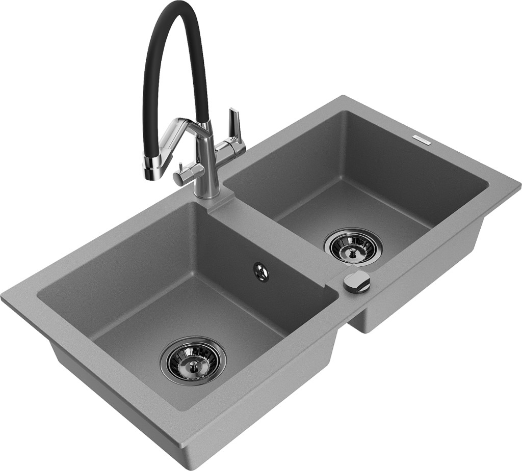 Technické dáta: drez: Rozmer: 820 x 436 x 161 mm Hĺbka komory: 151 mm Rozmery komory: 356x336 mm Priemer odtoku: ø90 mm Typ: 2-komorový Typ: Zapustené do pracovnej dosky Šedá farba Povrchová úprava sifónu: čierna Materiál: žula (80% žulové kamenivo, 20% živice) Prepadový otvor: Áno Otvory: (batérie, automatické) 2 Vysoká odolnosť proti poškriabaniu a zmene farby Odolnosť proti tepelným šokom Ľahko čistiteľný povrch kuchynská batéria: Materiál: mosadz Farba: chróm/čierna Hlavy: Keramické Prevzdušňovač: Áno Typ hubica: Flexibilný s mosadzným držiakom Rozsah výtoku: 260 mm Výška: 405 mm Typ: Dve rukoväte Dvojhlavá batéria s prídavným filtrom na pitnú vodu(GT) Ean: 5905315046413