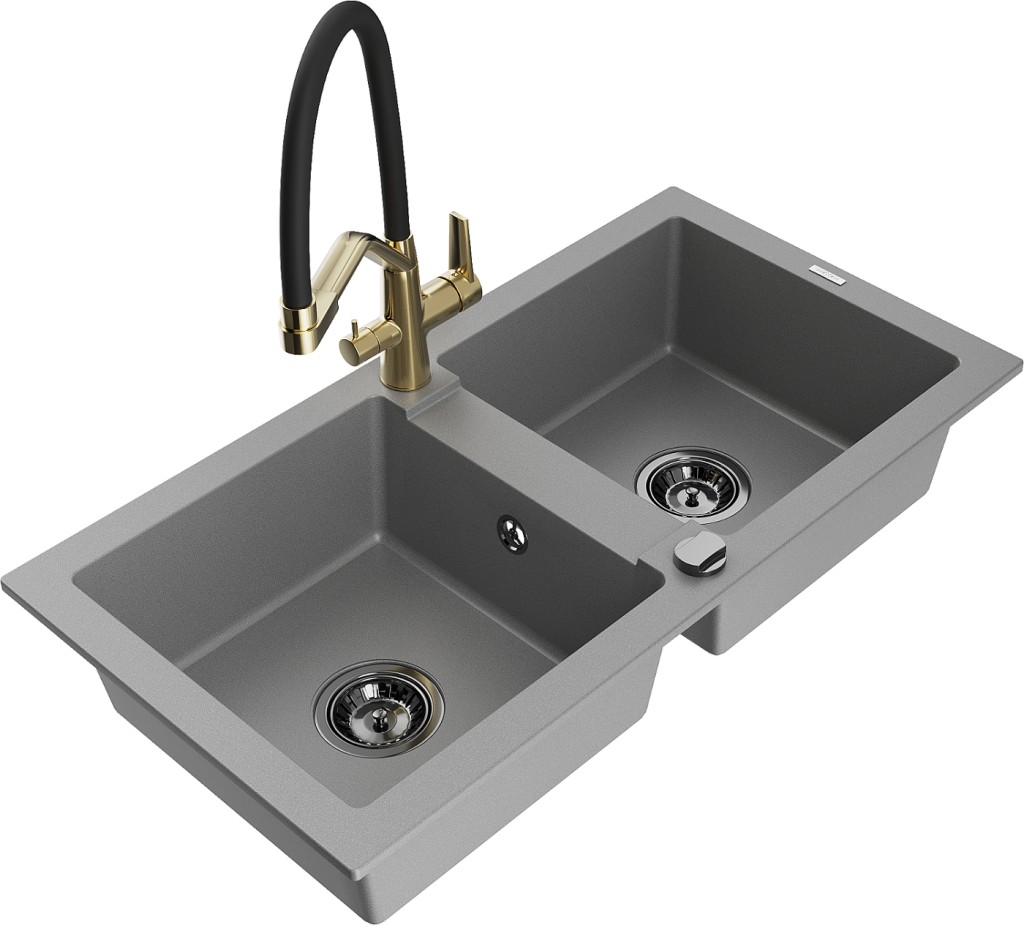 Technické dáta: drez: Rozmer: 820 x 436 x 161 mm Hĺbka komory: 151 mm Rozmery komory: 356x336 mm Priemer odtoku: ø90 mm Typ: 2-komorový Typ: Zapustené do pracovnej dosky Šedá farba Povrchová úprava sifónu: čierna Materiál: žula (80% žulové kamenivo, 20% živice) Prepadový otvor: Áno Otvory: (batérie, automatické) 2 Vysoká odolnosť proti poškriabaniu a zmene farby Odolnosť proti tepelným šokom Ľahko čistiteľný povrch kuchynská batéria: Materiál: mosadz Farba: Zlatá/Čierna Hlavy: Keramické Prevzdušňovač: Áno Typ hubica: Flexibilný s mosadzným držiakom Rozsah výtoku: 260 mm Výška: 405 mm Typ: Dve rukoväte Dvojhlavá batéria s prídavným filtrom na pitnú vodu(GT) Ean: 5905315046536