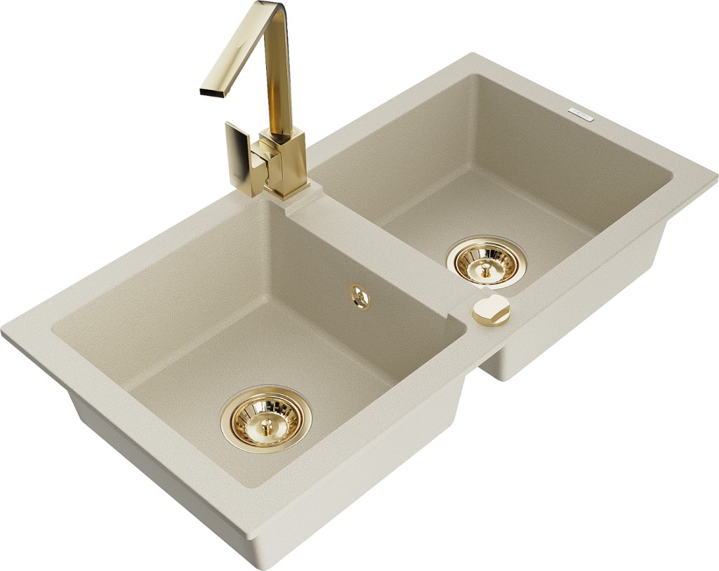 Technické dáta: drez: Rozmer: 820 x 436 x 161 mm Hĺbka komory: 151 mm Rozmery komory: 356x336 mm Priemer odtoku: ø90 mm Typ: 2-komorový Typ: Zapustené do pracovnej dosky Farba béžová Povrchová úprava sifónu: zlatá Materiál: žula (80% žulové kamenivo, 20% živice) Prepadový otvor: Áno Otvory: (batérie, automatické) 2 Vysoká odolnosť proti poškriabaniu a zmene farby Odolnosť proti tepelným šokom Ľahko čistiteľný povrch kuchynská batéria: Materiál: mosadz Farba: Zlatá Hlava: Keramická Prevzdušňovač: Áno Typ: Jedna páka Výška batérie: 290 mm Rozsah výtoku: 220 mm(GT) Ean: 5905315017918
