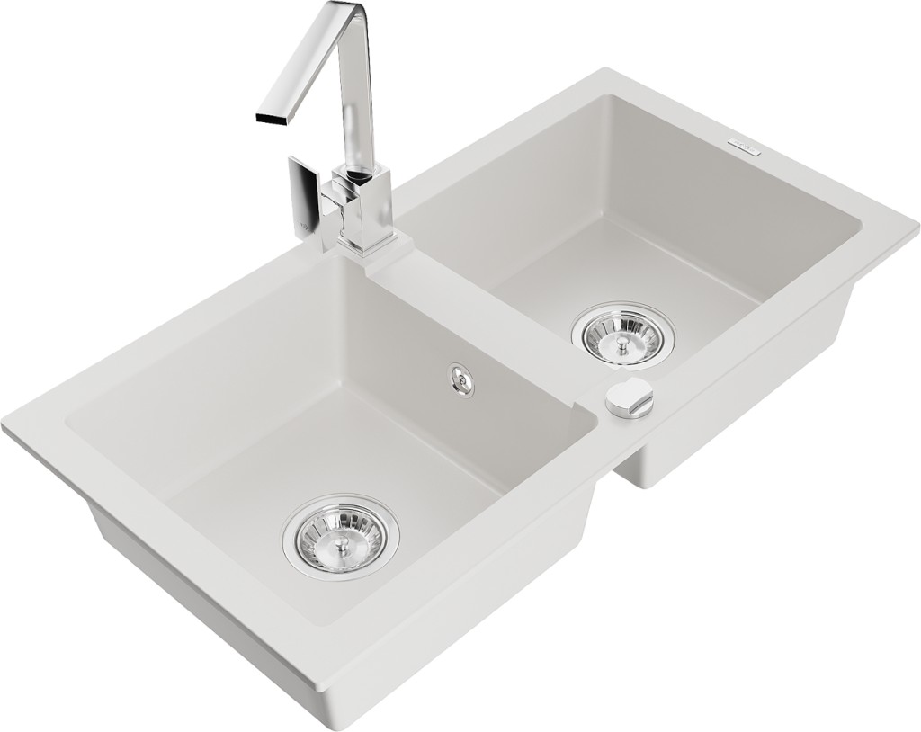 Technické dáta: drez: Rozmer: 820 x 436 x 161 mm Hĺbka komory: 151 mm Rozmery komory: 356x336 mm Priemer odtoku: ø90 mm Typ: 2-komorový Typ: Zapustené do pracovnej dosky biela farba Povrchová úprava sifónu: Chrome Materiál: žula (80% žulové kamenivo, 20% živice) Prepadový otvor: Áno Otvory: (batérie, automatické) 2 Vysoká odolnosť proti poškriabaniu a zmene farby Odolnosť proti tepelným šokom Ľahko čistiteľný povrch kuchynská batéria: Materiál: mosadz Farba: Chrome Hlava: Keramická Prevzdušňovač: Áno Typ: Jedna páka Výška batérie: 290 mm Rozsah výtoku: 220 mm(GT) Ean: 5905315017857
