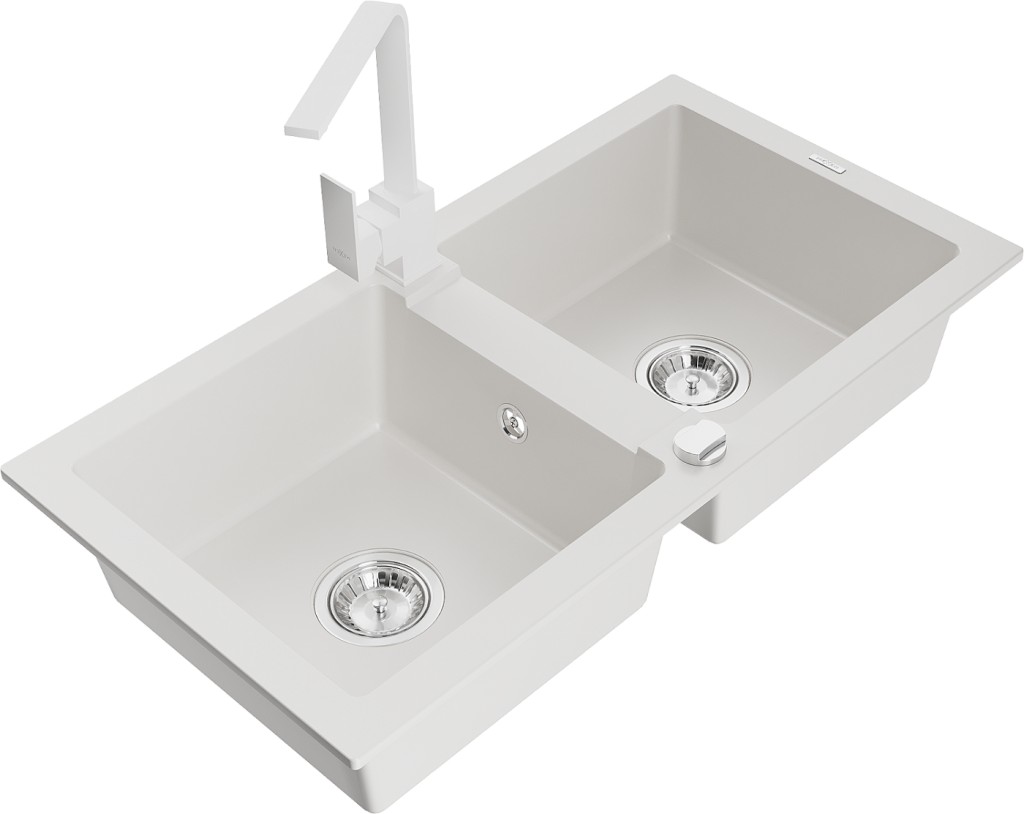 Technické dáta: drez: Rozmer: 820 x 436 x 161 mm Hĺbka komory: 151 mm Rozmery komory: 356x336 mm Priemer odtoku: ø90 mm Typ: 2-komorový Typ: Zapustené do pracovnej dosky biela farba Povrchová úprava sifónu: Chrome Materiál: žula (80% žulové kamenivo, 20% živice) Prepadový otvor: Áno Otvory: (batérie, automatické) 2 Vysoká odolnosť proti poškriabaniu a zmene farby Odolnosť proti tepelným šokom Ľahko čistiteľný povrch kuchynská batéria: Materiál: mosadz biela farba Hlava: Keramická Prevzdušňovač: Áno Typ: Jedna páka Výška batérie: 290 mm Rozsah výtoku: 220 mm(GT) Ean: 5905315017864