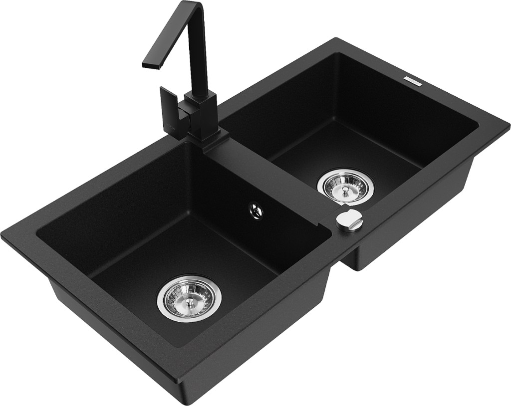 Technické dáta: drez: Rozmer: 820 x 436 x 161 mm Hĺbka komory: 151 mm Rozmery komory: 356x336 mm Priemer odtoku: ø90 mm Typ: 2-komorový Typ: Zapustené do pracovnej dosky Čierna farba Povrchová úprava sifónu: Chrome Materiál: žula (80% žulové kamenivo, 20% živice) Prepadový otvor: Áno Otvory: (batérie, automatické) 2 Vysoká odolnosť proti poškriabaniu a zmene farby Odolnosť proti tepelným šokom Ľahko čistiteľný povrch kuchynská batéria: Materiál: mosadz Čierna farba Hlava: Keramická Prevzdušňovač: Áno Typ: Jedna páka Výška batérie: 290 mm Rozsah výtoku: 220 mm(GT) Ean: 5905315018151