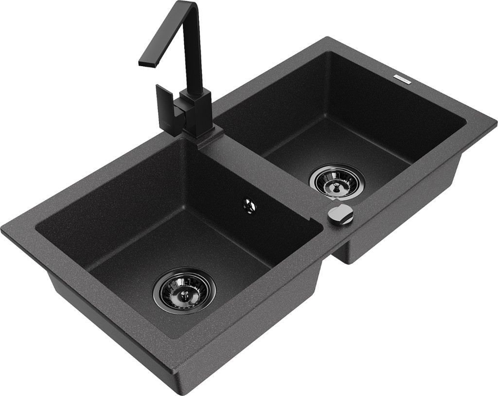 Technické dáta: drez: Rozmer: 820 x 436 x 161 mm Hĺbka komory: 151 mm Rozmery komory: 356x336 mm Priemer odtoku: ø90 mm Typ: 2-komorový Typ: Zapustené do pracovnej dosky Farba: Škvrnitá čierna Povrchová úprava sifónu: čierna Materiál: žula (80% žulové kamenivo, 20% živice) Prepadový otvor: Áno Otvory: (batérie, automatické) 2 Vysoká odolnosť proti poškriabaniu a zmene farby Odolnosť proti tepelným šokom Ľahko čistiteľný povrch kuchynská batéria: Materiál: mosadz Čierna farba Hlava: Keramická Prevzdušňovač: Áno Typ: Jedna páka Výška batérie: 290 mm Rozsah výtoku: 220 mm(GT) Ean: 5905315018106