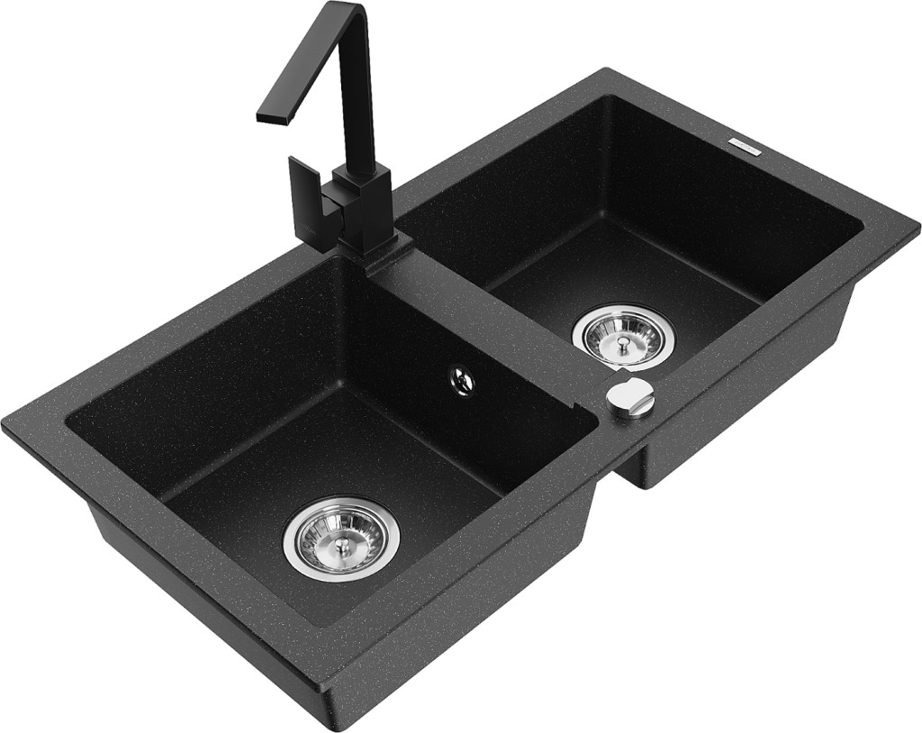 Technické dáta: drez: Rozmer: 820 x 436 x 161 mm Hĺbka komory: 151 mm Rozmery komory: 356x336 mm Priemer odtoku: ø90 mm Typ: 2-komorový Typ: Zapustené do pracovnej dosky Farba: čierna/strieborná metalíza Povrchová úprava sifónu: Chrome Materiál: žula (80% žulové kamenivo, 20% živice) Prepadový otvor: Áno Otvory: (batérie, automatické) 2 Vysoká odolnosť proti poškriabaniu a zmene farby Odolnosť proti tepelným šokom Ľahko čistiteľný povrch kuchynská batéria: Materiál: mosadz Čierna farba Hlava: Keramická Prevzdušňovač: Áno Typ: Jedna páka Výška batérie: 290 mm Rozsah výtoku: 220 mm(GT) Ean: 5905315018007