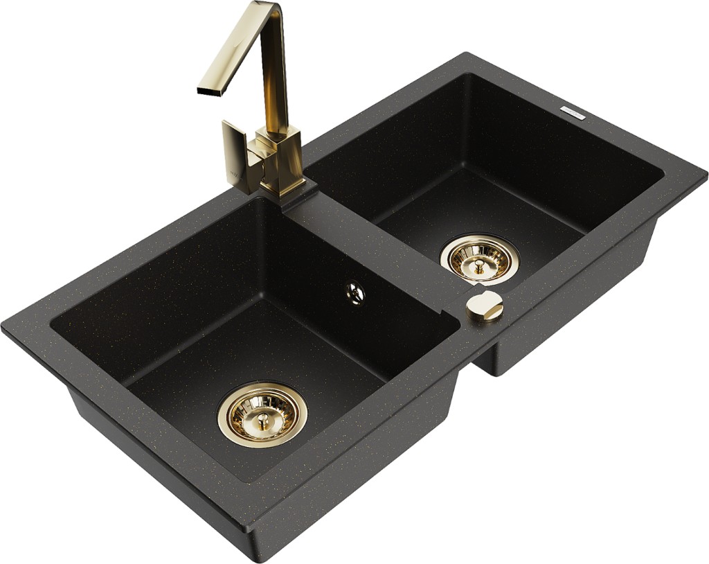 Technické dáta: drez: Rozmer: 820 x 436 x 161 mm Hĺbka komory: 151 mm Rozmery komory: 356x336 mm Priemer odtoku: ø90 mm Typ: 2-komorový Typ: Zapustené do pracovnej dosky Farba: čierna / zlatá metalíza Povrchová úprava sifónu: zlatá Materiál: žula (80% žulové kamenivo, 20% živice) Prepadový otvor: Áno Otvory: (batérie, automatické) 2 Vysoká odolnosť proti poškriabaniu a zmene farby Odolnosť proti tepelným šokom Ľahko čistiteľný povrch kuchynská batéria: Materiál: mosadz Farba: Zlatá Hlava: Keramická Prevzdušňovač: Áno Typ: Jedna páka Výška batérie: 290 mm Rozsah výtoku: 220 mm(GT) Ean: 5905315018038