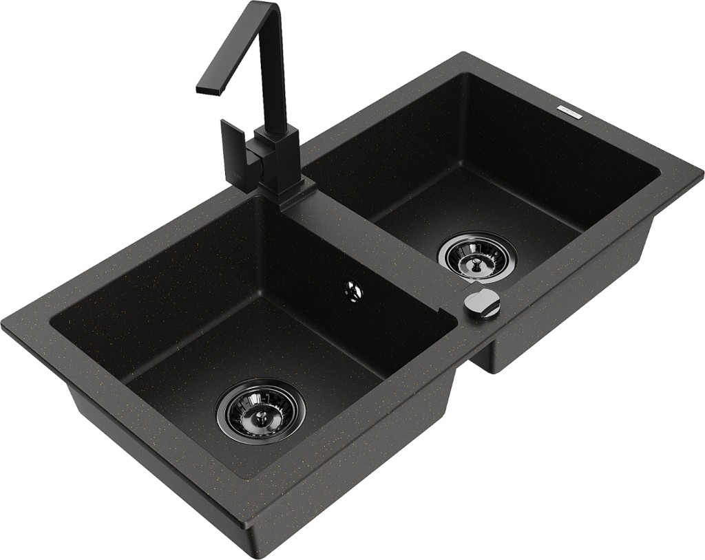 Technické dáta: drez: Rozmer: 820 x 436 x 161 mm Hĺbka komory: 151 mm Rozmery komory: 356x336 mm Priemer odtoku: ø90 mm Typ: 2-komorový Typ: Zapustené do pracovnej dosky Farba: čierna / zlatá metalíza Povrchová úprava sifónu: Chrome Materiál: žula (80% žulové kamenivo, 20% živice) Prepadový otvor: Áno Otvory: (batérie, automatické) 2 Vysoká odolnosť proti poškriabaniu a zmene farby Odolnosť proti tepelným šokom Ľahko čistiteľný povrch kuchynská batéria: Materiál: mosadz Čierna farba Hlava: Keramická Prevzdušňovač: Áno Typ: Jedna páka Výška batérie: 290 mm Rozsah výtoku: 220 mm(GT) Ean: 5905315018069