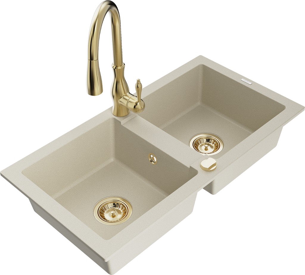 Technické dáta: drez: Rozmer: 820 x 436 x 161 mm Hĺbka komory: 151 mm Rozmery komory: 356x336 mm Priemer odtoku: ø90 mm Typ: 2-komorový Typ: Zapustené do pracovnej dosky Farba béžová Povrchová úprava sifónu: zlatá Materiál: žula (80% žulové kamenivo, 20% živice) Prepadový otvor: Áno Otvory: (batérie, automatické) 2 Vysoká odolnosť proti poškriabaniu a zmene farby Odolnosť proti tepelným šokom Ľahko čistiteľný povrch kuchynská batéria: Materiál: mosadz Farba: Zlatá Hlava: Keramická Prevzdušňovač: Áno Typ: Jedna páka Výška batérie: 410 mm Rozsah výtoku: 231 mm(GT) Ean: 5905315033277