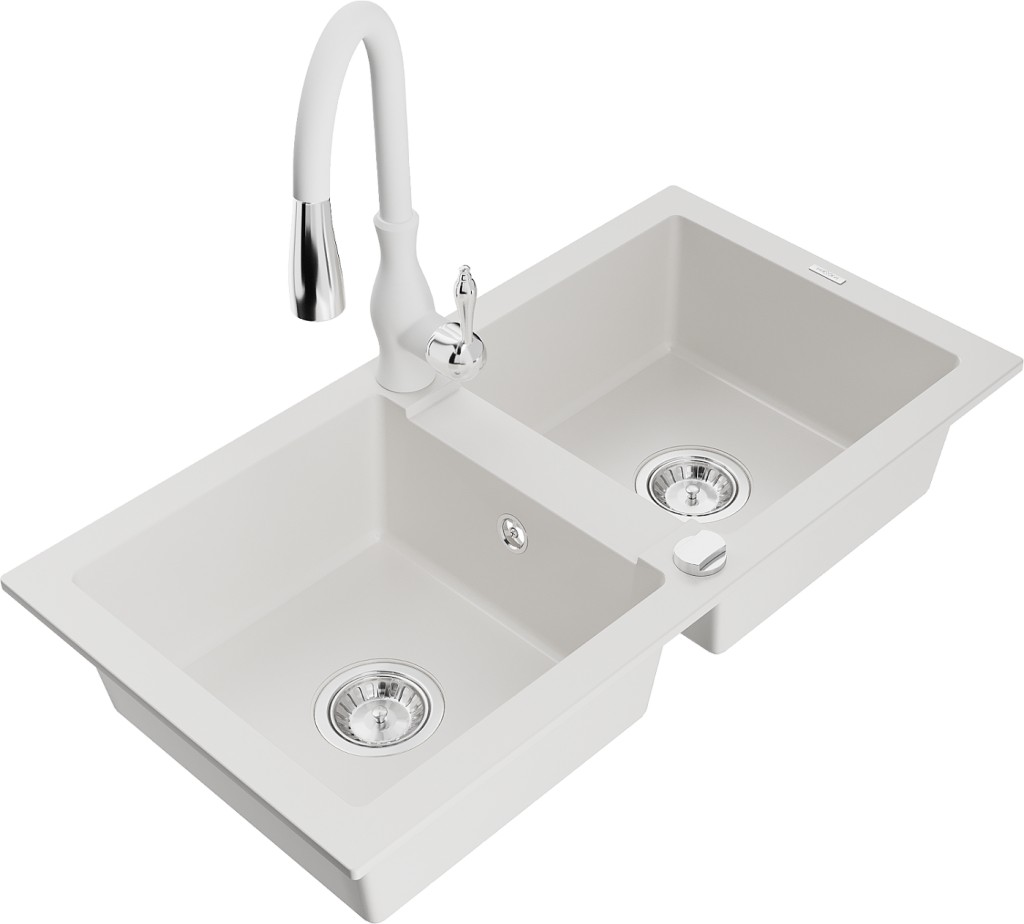 Technické dáta: drez: Rozmer: 820 x 436 x 161 mm Hĺbka komory: 151 mm Rozmery komory: 356x336 mm Priemer odtoku: ø90 mm Typ: 2-komorový Typ: Zapustené do pracovnej dosky biela farba Povrchová úprava sifónu: Chrome Materiál: žula (80% žulové kamenivo, 20% živice) Prepadový otvor: Áno Otvory: (batérie, automatické) 2 Vysoká odolnosť proti poškriabaniu a zmene farby Odolnosť proti tepelným šokom Ľahko čistiteľný povrch kuchynská batéria: Materiál: mosadz biela farba Hlava: Keramická Prevzdušňovač: Áno Typ: Jedna páka Výška batérie: 410 mm Rozsah výtoku: 231 mm (GT) Ean: 5905315033222