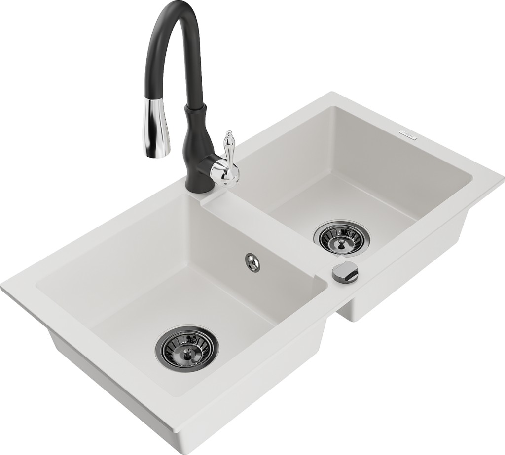 Technické dáta: drez: Rozmer: 820 x 436 x 161 mm Hĺbka komory: 151 mm Rozmery komory: 356x336 mm Priemer odtoku: ø90 mm Typ: 2-komorový Typ: Zapustené do pracovnej dosky biela farba Povrchová úprava sifónu: čierna Materiál: žula (80% žulové kamenivo, 20% živice) Prepadový otvor: Áno Otvory: (batérie, automatické) 2 Vysoká odolnosť proti poškriabaniu a zmene farby Odolnosť proti tepelným šokom Ľahko čistiteľný povrch kuchynská batéria: Materiál: mosadz Čierna farba Hlava: Keramická Prevzdušňovač: Áno Typ: Jedna páka Výška batérie: 410 mm Rozsah výtoku: 231 mm(GT) Ean: 5905315033246
