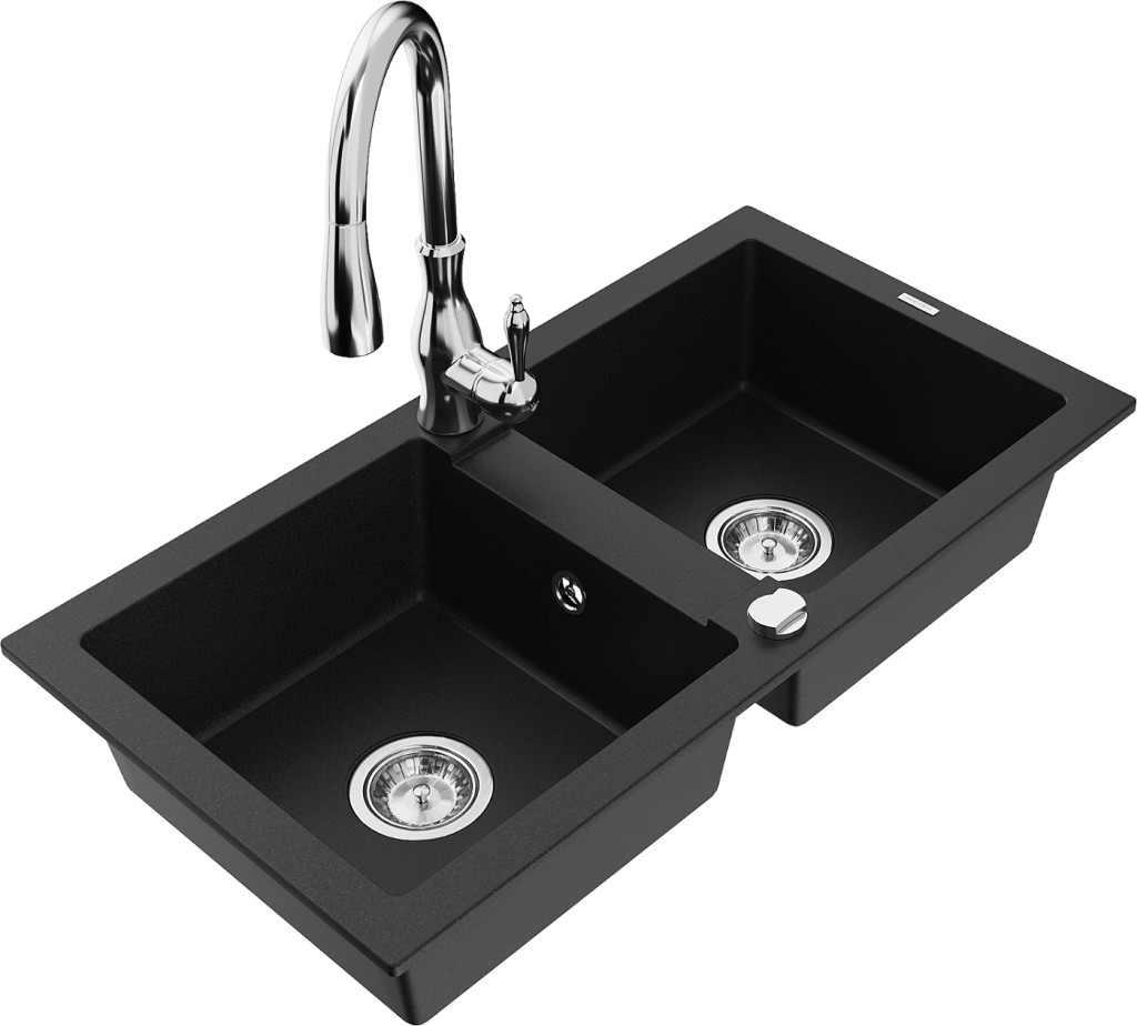 Technické dáta: drez: Rozmer: 820 x 436 x 161 mm Hĺbka komory: 151 mm Rozmery komory: 356x336 mm Priemer odtoku: ø90 mm Typ: 2-komorový Typ: Zapustené do pracovnej dosky Čierna farba Povrchová úprava sifónu: Chrome Materiál: žula (80% žulové kamenivo, 20% živice) Prepadový otvor: Áno Otvory: (batérie, automatické) 2 Vysoká odolnosť proti poškriabaniu a zmene farby Odolnosť proti tepelným šokom Ľahko čistiteľný povrch kuchynská batéria: Materiál: mosadz Farba: Chrome Hlava: Keramická Prevzdušňovač: Áno Typ: Jedna páka Výška batérie: 410 mm Rozsah výtoku: 231 mm(GT) Ean: 5905315033482