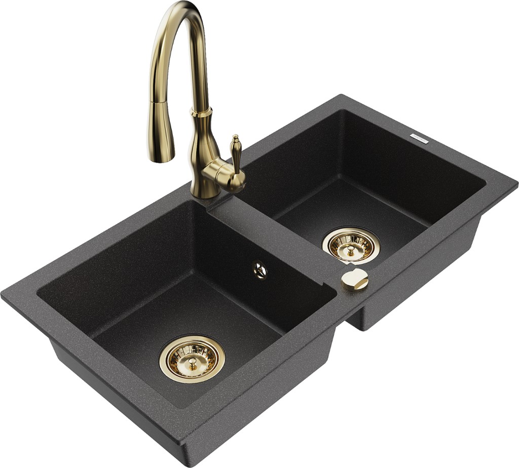 Technické dáta: drez: Rozmer: 820 x 436 x 161 mm Hĺbka komory: 151 mm Rozmery komory: 356x336 mm Priemer odtoku: ø90 mm Typ: 2-komorový Typ: Zapustené do pracovnej dosky Farba: Škvrnitá čierna Povrchová úprava sifónu: zlatá Materiál: žula (80% žulové kamenivo, 20% živice) Prepadový otvor: Áno Otvory: (batérie, automatické) 2 Vysoká odolnosť proti poškriabaniu a zmene farby Odolnosť proti tepelným šokom Ľahko čistiteľný povrch kuchynská batéria: Materiál: mosadz Farba: Zlatá Hlava: Keramická Prevzdušňovač: Áno Typ: Jedna páka Výška batérie: 410 mm Rozsah výtoku: 231 mm(GT) Ean: 5905315033444