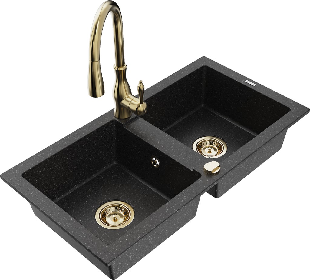 Technické dáta: drez: Rozmer: 820 x 436 x 161 mm Hĺbka komory: 151 mm Rozmery komory: 356x336 mm Priemer odtoku: ø90 mm Typ: 2-komorový Typ: Zapustené do pracovnej dosky Farba: čierna/strieborná metalíza Povrchová úprava sifónu: zlatá Materiál: žula (80% žulové kamenivo, 20% živice) Prepadový otvor: Áno Otvory: (batérie, automatické) 2 Vysoká odolnosť proti poškriabaniu a zmene farby Odolnosť proti tepelným šokom Ľahko čistiteľný povrch kuchynská batéria: Materiál: mosadz Farba: Zlatá Hlava: Keramická Prevzdušňovač: Áno Typ: Jedna páka Výška batérie: 410 mm Rozsah výtoku: 231 mm(GT) Ean: 5905315033352