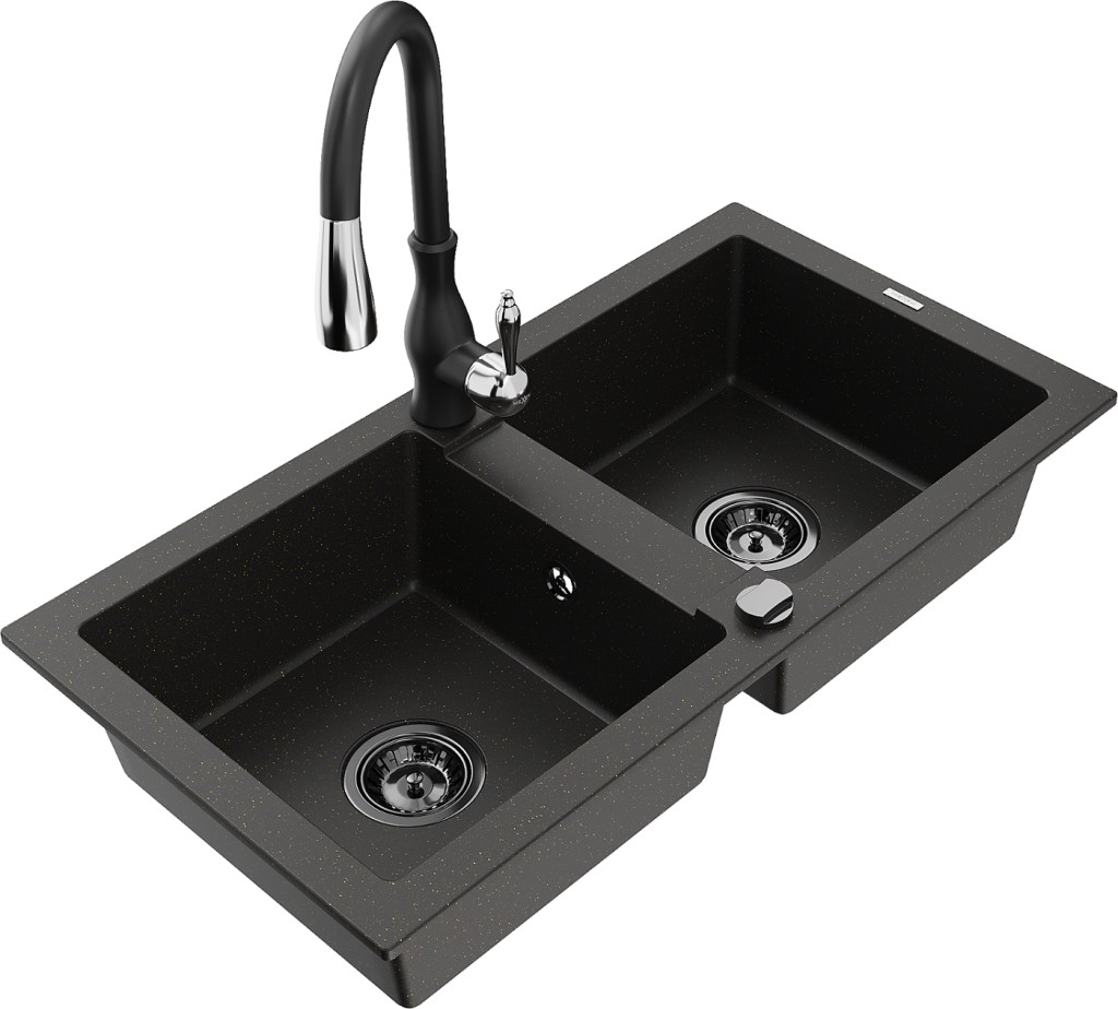 Technické dáta: drez: Rozmer: 820 x 436 x 161 mm Hĺbka komory: 151 mm Rozmery komory: 356x336 mm Priemer odtoku: ø90 mm Typ: 2-komorový Typ: Zapustené do pracovnej dosky Farba: čierna / zlatá metalíza Povrchová úprava sifónu: čierna Materiál: žula (80% žulové kamenivo, 20% živice) Prepadový otvor: Áno Otvory: (batérie, automatické) 2 Vysoká odolnosť proti poškriabaniu a zmene farby Odolnosť proti tepelným šokom Ľahko čistiteľný povrch kuchynská batéria: Materiál: mosadz Čierna farba Hlava: Keramická Prevzdušňovač: Áno Typ: Jedna páka Výška batérie: 410 mm Rozsah výtoku: 231 mm(GT) Ean: 5905315033420