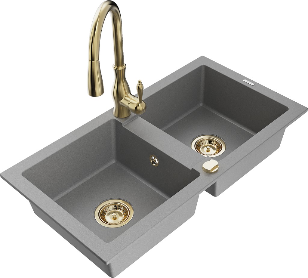 Technické dáta: drez: Rozmer: 820 x 436 x 161 mm Hĺbka komory: 151 mm Rozmery komory: 356x336 mm Priemer odtoku: ø90 mm Typ: 2-komorový Typ: Zapustené do pracovnej dosky Šedá farba Povrchová úprava sifónu: zlatá Materiál: žula (80% žulové kamenivo, 20% živice) Prepadový otvor: Áno Otvory: (batérie, automatické) 2 Vysoká odolnosť proti poškriabaniu a zmene farby Odolnosť proti tepelným šokom Ľahko čistiteľný povrch kuchynská batéria: Materiál: mosadz Farba: Zlatá Hlava: Keramická Prevzdušňovač: Áno Typ: Jedna páka Výška batérie: 410 mm Rozsah výtoku: 231 mm(GT) Ean: 5905315033307