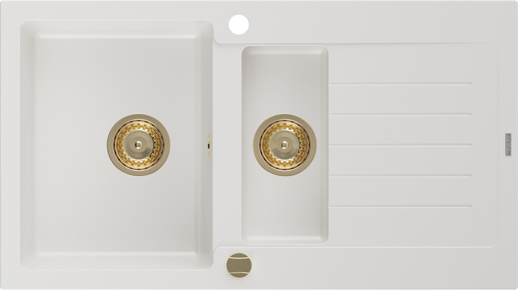 Technické dáta: Rozmer: 900x505x173mm Hĺbka komory: 170 mm (väčšia), 115 mm (menšia) Rozmery komory: 435x335 mm (väčšie), 345x150 mm (menšie) Priemer odtoku: ø90 mm Typ: 1,5-komorový s krátkym odkvapkávačom Typ: Zapustené do pracovnej dosky Materiál: žula biela farba Povrchová úprava sifónu: zlatá Prepadový otvor: Áno Otvor pre batériu: Áno Vrátane automatického sifónu Vysoká odolnosť proti poškriabaniu a zmene farby Odolnosť proti tepelným šokom Ľahko čistiteľný povrch Dva dodatočné vyfrézované otvory na samodierovanie ø35 (GT) Ean: 5905315011411
