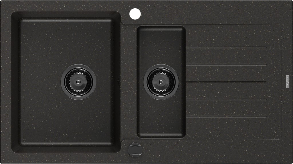 Technické dáta: Rozmer: 900x505x173mm Hĺbka komory: 170 mm (väčšia), 115 mm (menšia) Rozmery komory: 435x335 mm (väčšie), 345x150 mm (menšie) Priemer odtoku: ø90 mm Typ: 1,5-komorový s krátkym odkvapkávačom Typ: Zapustené do pracovnej dosky Materiál: žula Farba: čierna / zlatá metalíza Povrchová úprava sifónu: čierna Prepadový otvor: Áno Otvor pre batériu: Áno Vrátane automatického sifónu Vysoká odolnosť proti poškriabaniu a zmene farby Odolnosť proti tepelným šokom Ľahko čistiteľný povrch Dva dodatočné vyfrézované otvory na samodierovanie ø35 (GT) Ean: 5905315012647