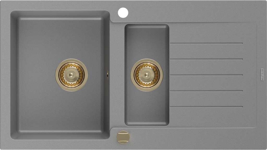 Technické dáta: Rozmer: 900x505x173mm Hĺbka komory: 170 mm (väčšia), 115 mm (menšia) Rozmery komory: 435x335 mm (väčšie), 345x150 mm (menšie) Priemer odtoku: ø90 mm Typ: 1,5-komorový s krátkym odkvapkávačom Typ: Zapustené do pracovnej dosky Materiál: žula Šedá farba Povrchová úprava sifónu: zlatá Prepadový otvor: Áno Otvor pre batériu: Áno Vrátane automatického sifónu Vysoká odolnosť proti poškriabaniu a zmene farby Odolnosť proti tepelným šokom Ľahko čistiteľný povrch Dva dodatočné vyfrézované otvory na samodierovanie ø35 (GT) Ean: 5905315011435
