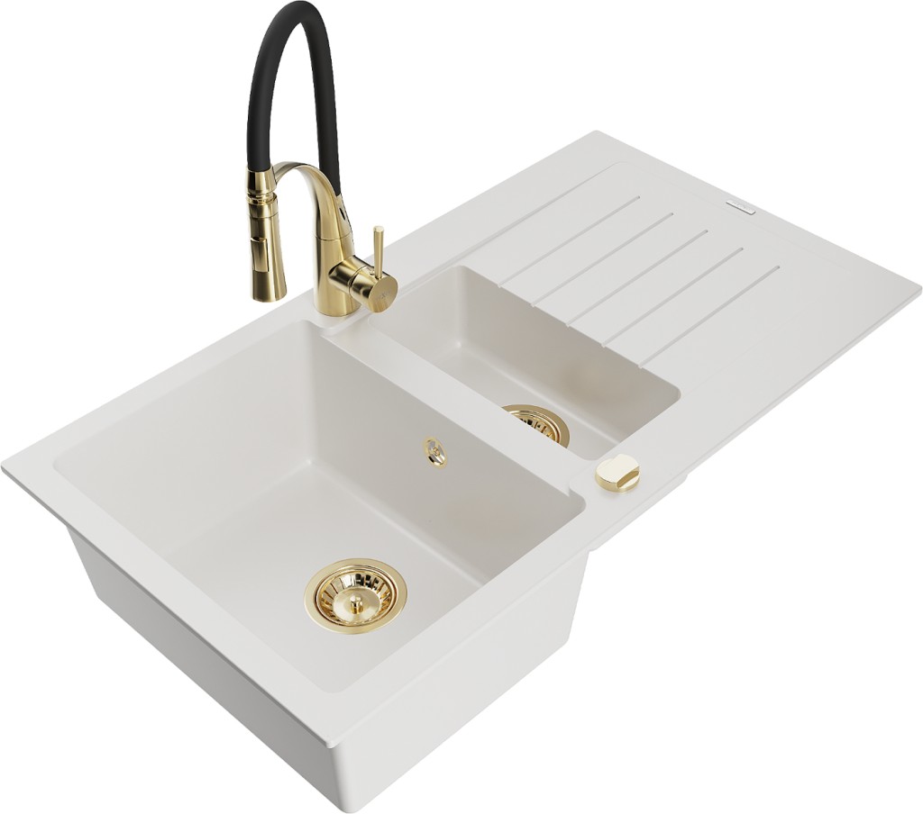 Technické dáta: drez: Rozmer: 900x505x200mm Hĺbka komory: 180 mm (väčšia), 115 mm (menšia) Rozmery komory: 435x335 mm (väčšie), 345x150 mm (menšie) Priemer odtoku: ø90 mm Typ: 1,5-komorový s krátkym odkvapkávačom Typ: Zapustené do pracovnej dosky biela farba Povrchová úprava sifónu: zlatá Materiál: žula (80% žulové kamenivo, 20% živice) Prepadový otvor: Áno Otvory: (batérie, automatické) 2 Inštalácia: Univerzálna, je možné inštalovať s odkvapkávačom na ľavú alebo pravú stranu Vysoká odolnosť proti poškriabaniu a zmene farby Odolnosť proti tepelným šokom Ľahko čistiteľný povrch Dva dodatočné vyfrézované otvory na samodierovanie ø35 kuchynská batéria: Materiál: mosadz Farba: Zlatá/Čierna Hlava: Keramická Prevzdušňovač: Áno Typ: Jedna páka Výška batérie: 430 mm Rozsah výtoku: 185 mm Batéria má výsuvný výtok(GT) Ean: 5905315042965