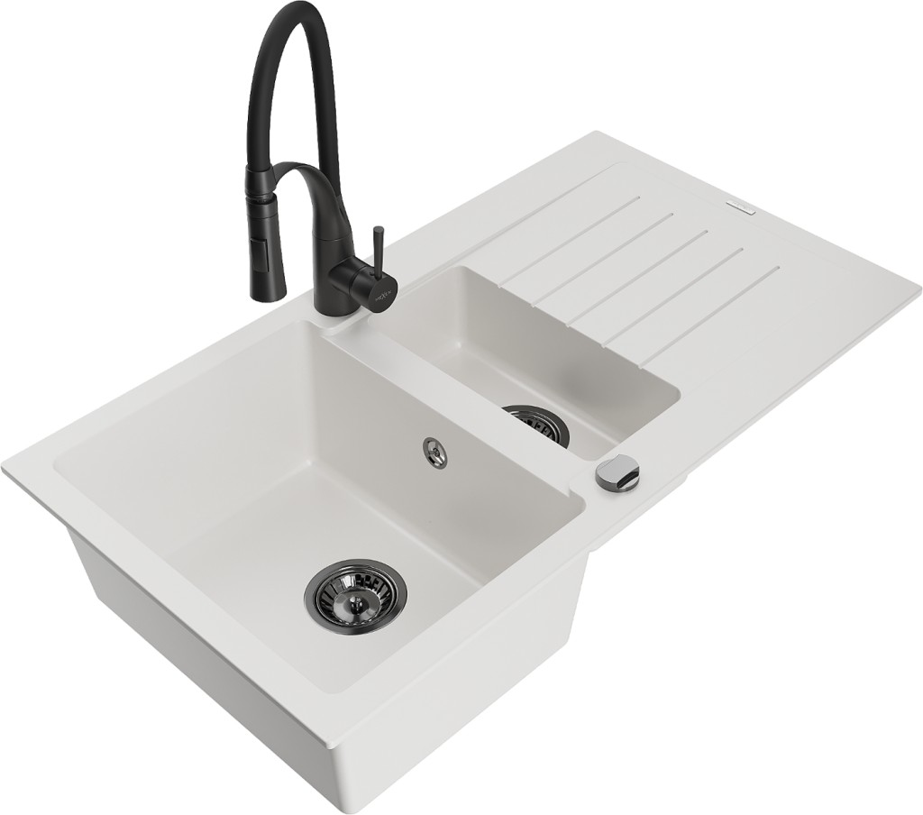 Technické dáta: drez: Rozmer: 900x505x200mm Hĺbka komory: 180 mm (väčšia), 115 mm (menšia) Rozmery komory: 435x335 mm (väčšie), 345x150 mm (menšie) Priemer odtoku: ø90 mm Typ: 1,5-komorový s krátkym odkvapkávačom Typ: Zapustené do pracovnej dosky biela farba Povrchová úprava sifónu: čierna Materiál: žula (80% žulové kamenivo, 20% živice) Prepadový otvor: Áno Otvory: (batérie, automatické) 2 Inštalácia: Univerzálna, je možné inštalovať s odkvapkávačom na ľavú alebo pravú stranu Vysoká odolnosť proti poškriabaniu a zmene farby Odolnosť proti tepelným šokom Ľahko čistiteľný povrch Dva dodatočné vyfrézované otvory na samodierovanie ø35 kuchynská batéria: Materiál: mosadz Čierna farba Hlava: Keramická Prevzdušňovač: Áno Typ: Jedna páka Výška batérie: 430 mm Rozsah výtoku: 185 mm Batéria má výsuvný výtok(GT) Ean: 5905315042989