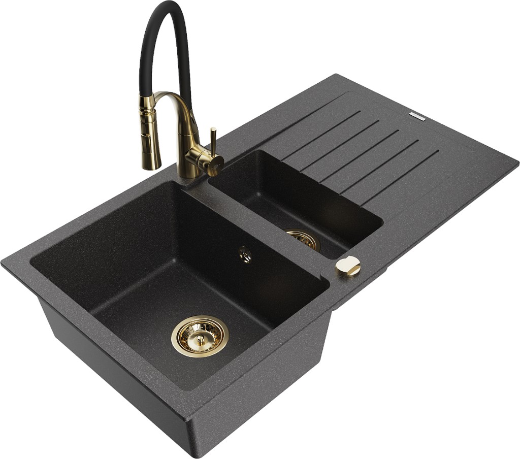 Technické dáta: drez: Rozmer: 900x505x200mm Hĺbka komory: 180 mm (väčšia), 115 mm (menšia) Rozmery komory: 435x335 mm (väčšie), 345x150 mm (menšie) Priemer odtoku: ø90 mm Typ: 1,5-komorový s krátkym odkvapkávačom Typ: Zapustené do pracovnej dosky Farba: Škvrnitá čierna Povrchová úprava sifónu: zlatá Materiál: žula (80% žulové kamenivo, 20% živice) Prepadový otvor: Áno Otvory: (batérie, automatické) 2 Inštalácia: Univerzálna, je možné inštalovať s odkvapkávačom na ľavú alebo pravú stranu Vysoká odolnosť proti poškriabaniu a zmene farby Odolnosť proti tepelným šokom Ľahko čistiteľný povrch Dva dodatočné vyfrézované otvory na samodierovanie ø35 kuchynská batéria: Materiál: mosadz Farba: Zlatá/Čierna Hlava: Keramická Prevzdušňovač: Áno Typ: Jedna páka Výška batérie: 430 mm Rozsah výtoku: 185 mm Batéria má výsuvný výtok(GT) Ean: 5905315043269