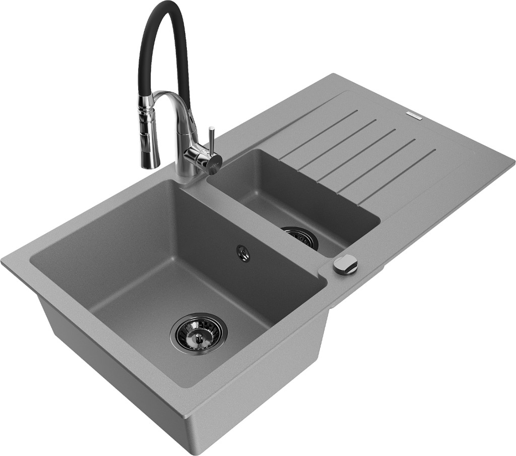 Technické dáta: drez: Rozmer: 900x505x200mm Hĺbka komory: 180 mm (väčšia), 115 mm (menšia) Rozmery komory: 435x335 mm (väčšie), 345x150 mm (menšie) Priemer odtoku: ø90 mm Typ: 1,5-komorový s krátkym odkvapkávačom Typ: Zapustené do pracovnej dosky Šedá farba Povrchová úprava sifónu: čierna Materiál: žula (80% žulové kamenivo, 20% živice) Prepadový otvor: Áno Otvory: (batérie, automatické) 2 Inštalácia: Univerzálna, je možné inštalovať s odkvapkávačom na ľavú alebo pravú stranu Vysoká odolnosť proti poškriabaniu a zmene farby Odolnosť proti tepelným šokom Ľahko čistiteľný povrch Dva dodatočné vyfrézované otvory na samodierovanie ø35 kuchynská batéria: Materiál: mosadz Farba: chróm/čierna Hlava: Keramická Prevzdušňovač: Áno Typ: Jedna páka Výška batérie: 430 mm Rozsah výtoku: 185 mm Batéria má výsuvný výtok(GT) Ean: 5905315043078